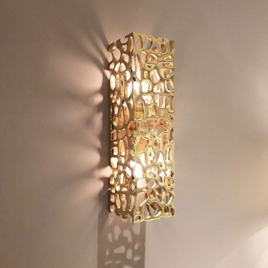 Sculptural cast-brass wall-mounted shade in organic openwork motif, with two medium base socket. Available in a selection of finishes.