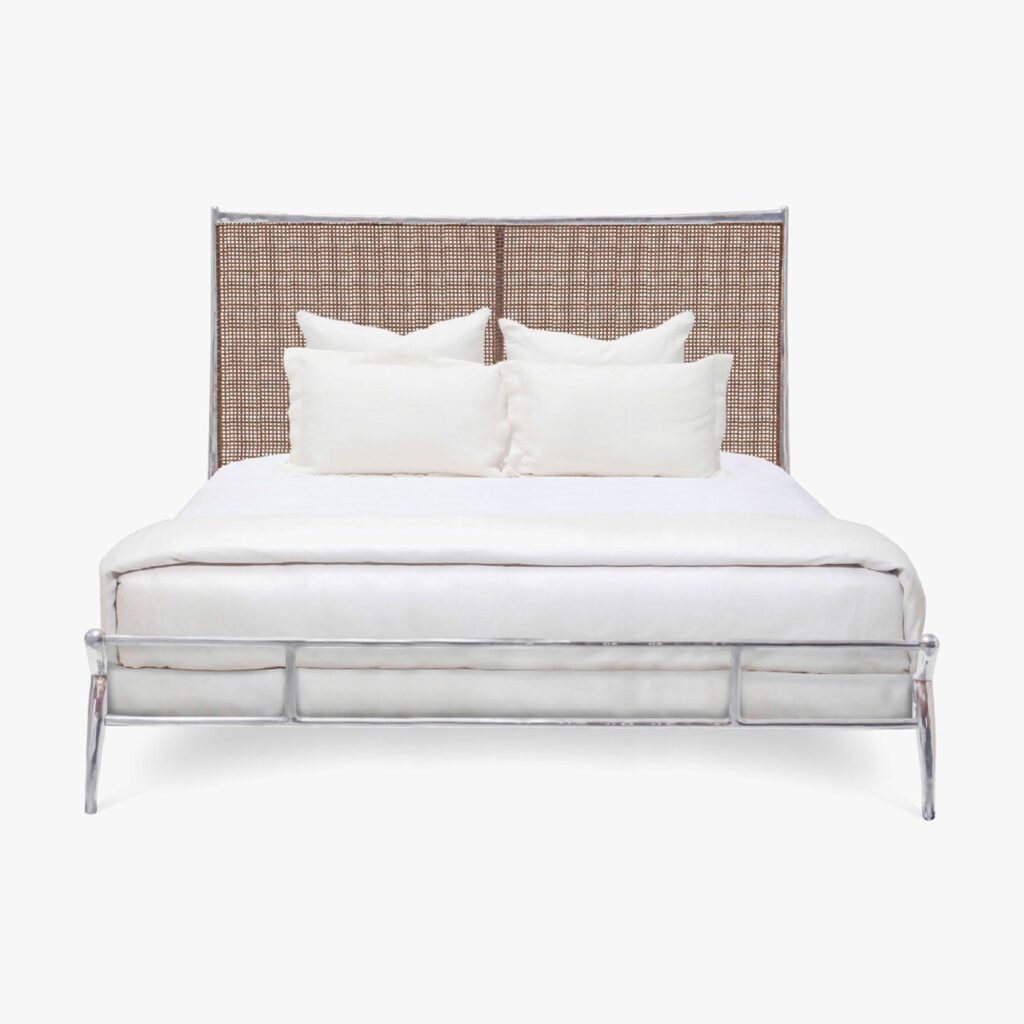 Sleigh-style bed frame in semi-polished cast aluminum with woven antique brass headboard webbing, carved wood "cap" on side rails.