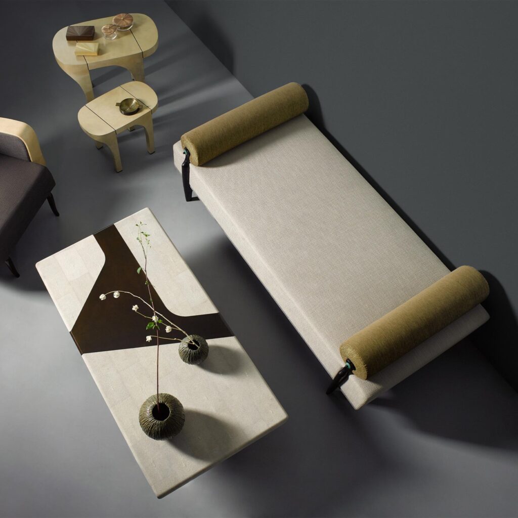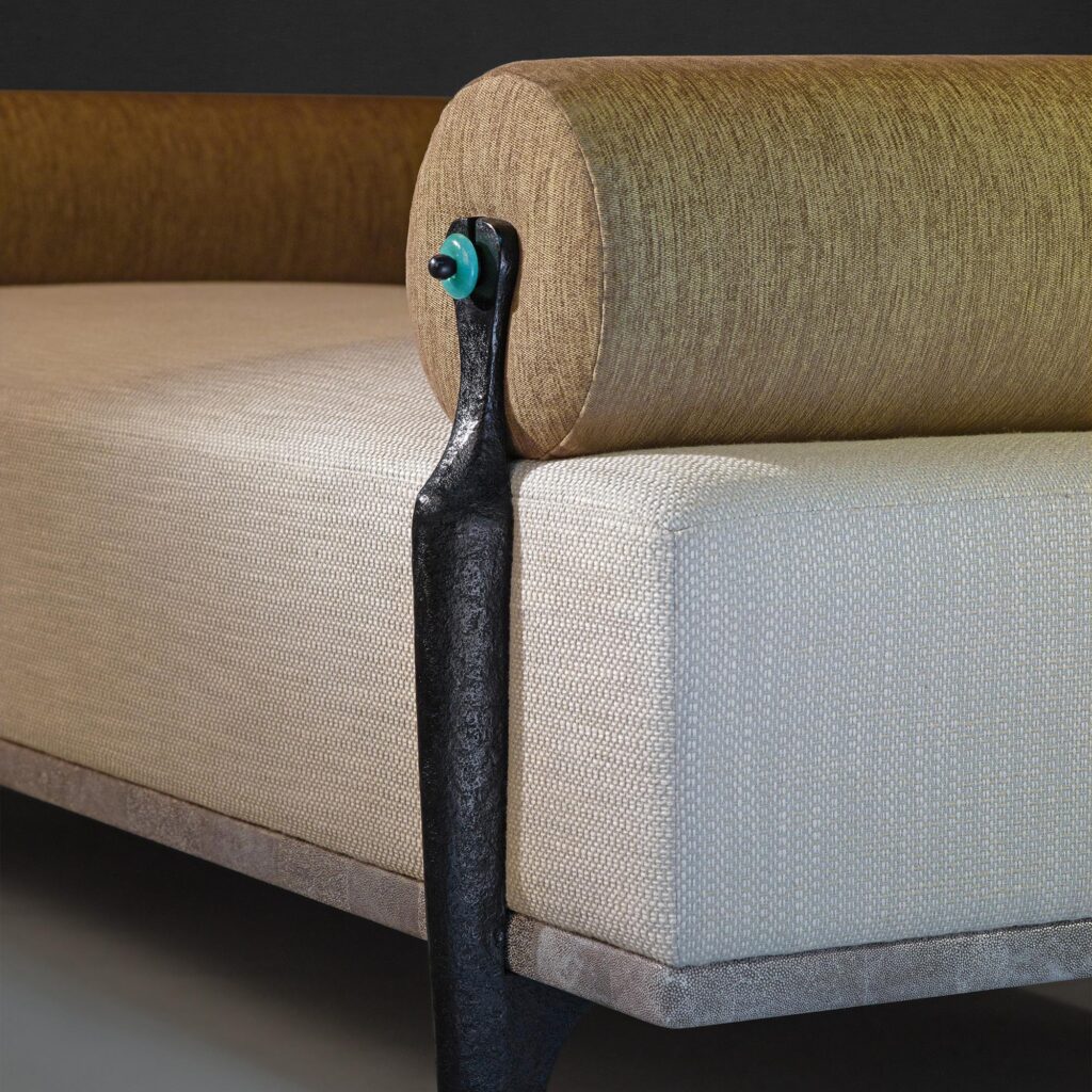 The Galeria Daybed is an architectural, versatile and luxuriously upholstered daybed. It brings a contemporary functional form, accented with elegant details, to living or bedroom spaces. Hand-tied and sprung, the seat is comfortable, minimal and keeps its form beautifully. The upholstery sits on a raw shagreen platform that is raised by sculpted bronze legs, while semi-precious buttons hold the round cushions in place.