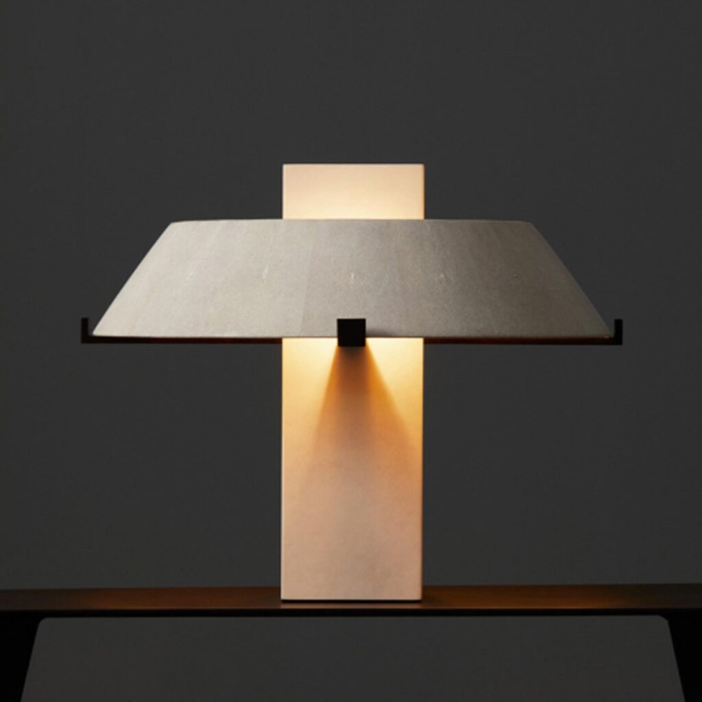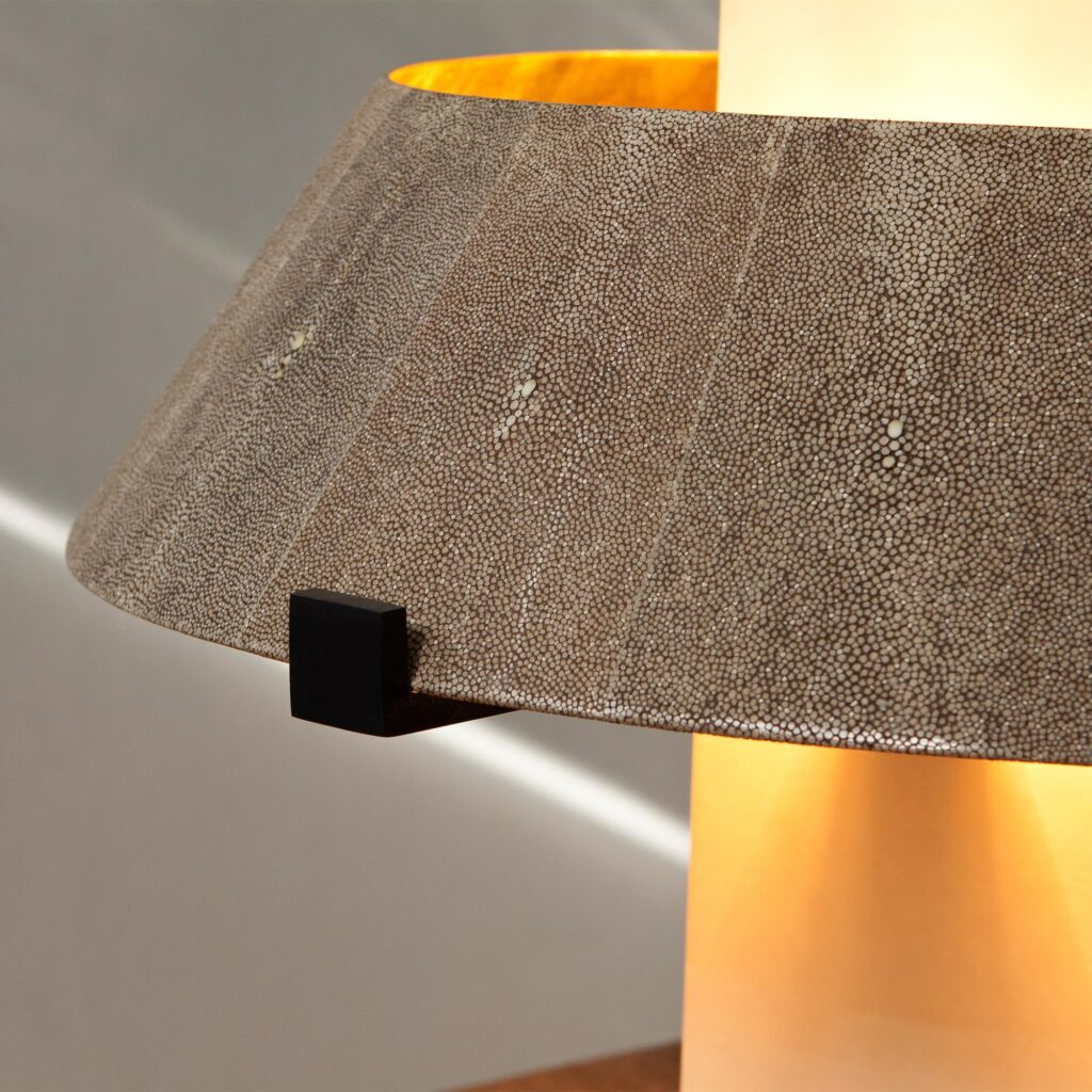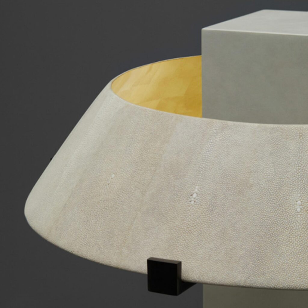 A lighting element of architectural simplicity, the Geo Table Lamp has an Ivory parchment column and shagreen shade that is lined with pure gold leaf and supported by bronze arms. The lamp has four bulb sockets. The simple geometric shape of the lamp is complemented by the mottled shagreen texture and the warm glow of gold leaf.