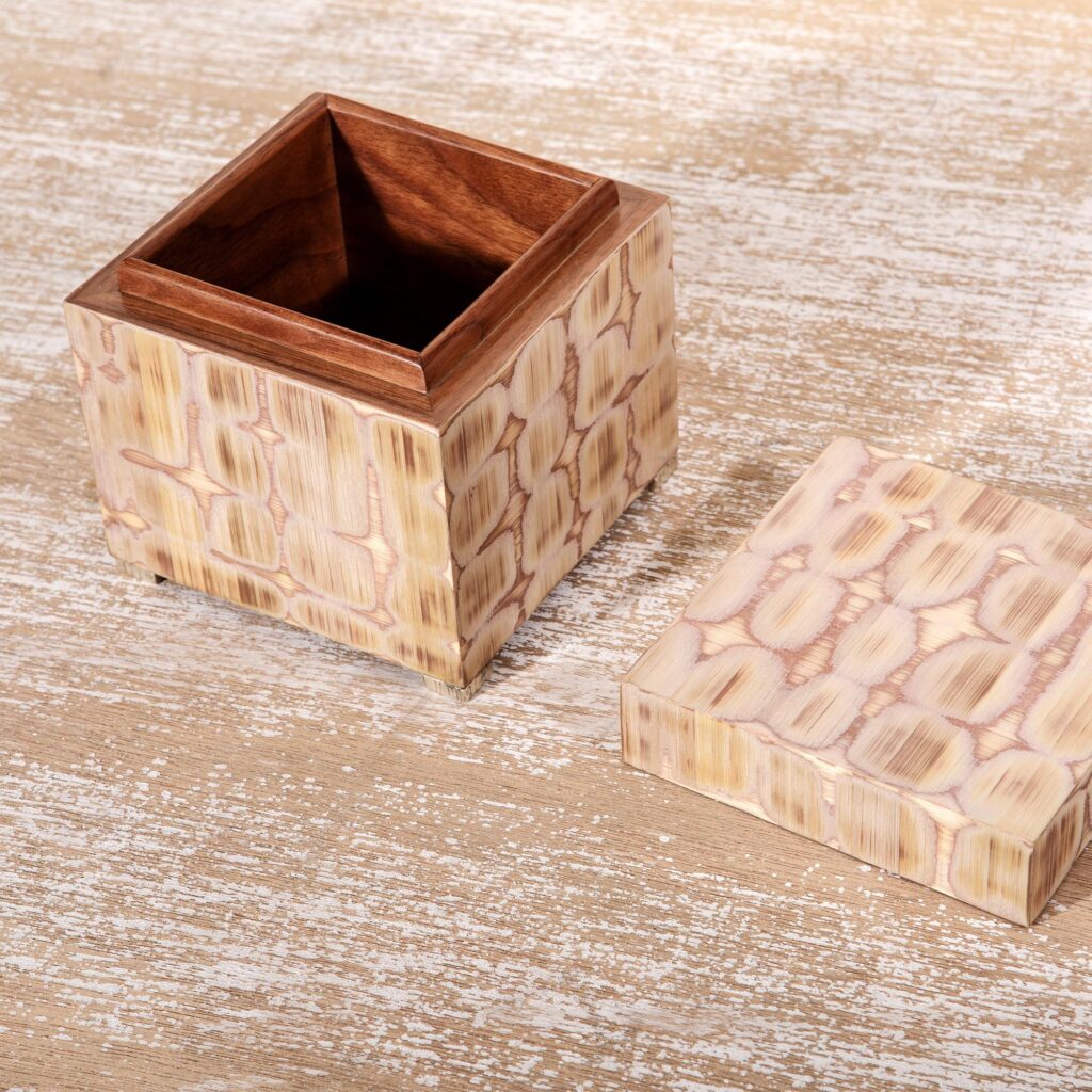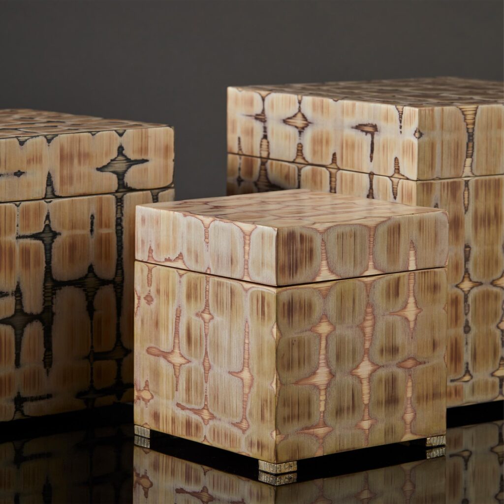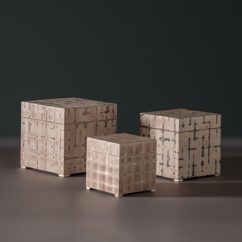 Mantle – the sea bed, caught and dappled by the sun in the shallows, the light changing as you move around it. To achieve this unique sense of depth, layers of straw have been applied and then rubbed through to reveal the lower surfaces reflecting beneath. This special technique is applied onto Walnut cube boxes raised on silvered feet. On a coffee table, shelf or vanity, these forms will seduce eyes and hands and conversation.