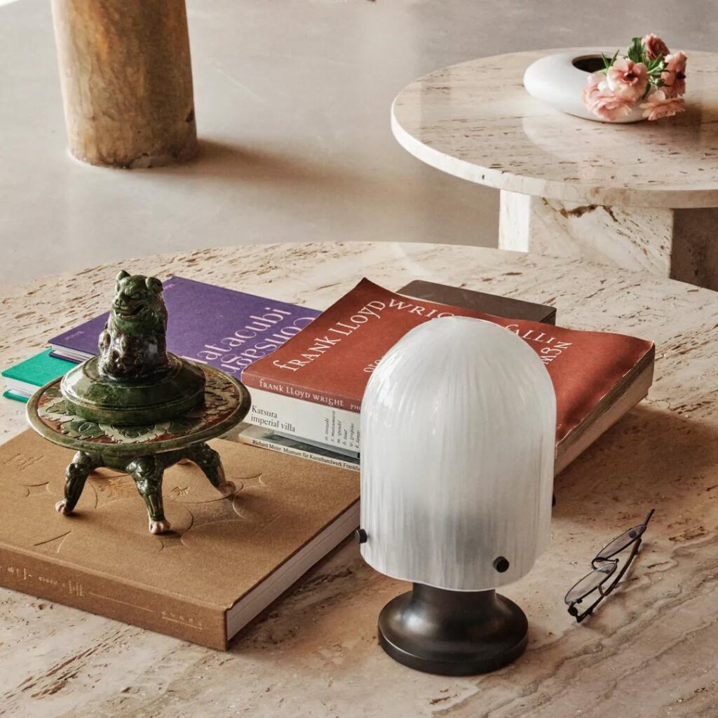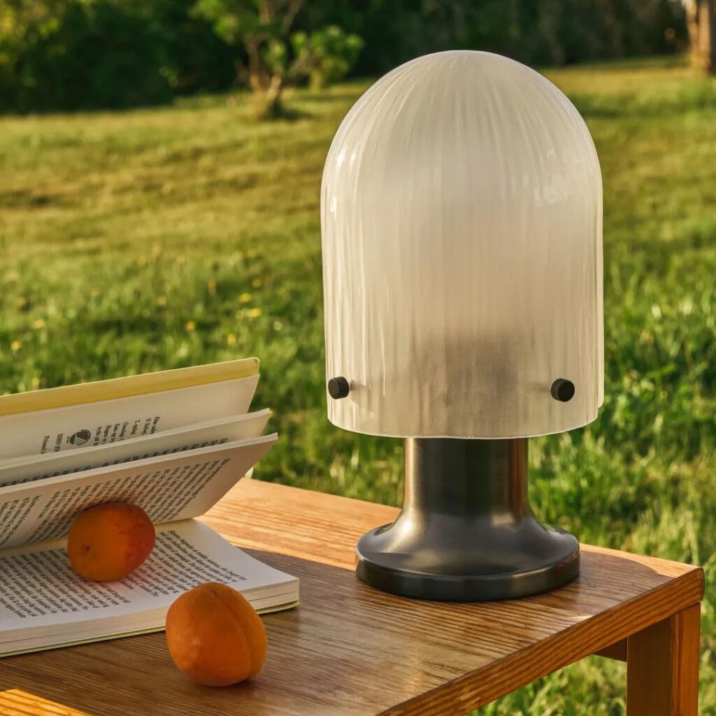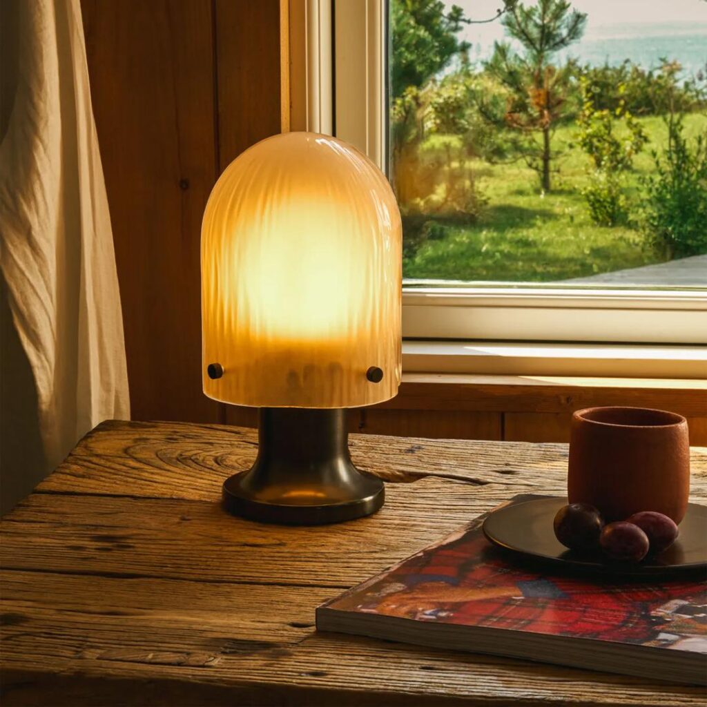 The portable version of Space Copenhagen’s Seine Table Lamp brings the design’s magical and atmospheric play of light to both indoor and outdoor spaces. Inspired by the behavior of light and water, it features a mouth-blown sandblasted glass shade with a sandblasted finish. The Seine Portable Lamp is supplied with a USB-C docking station, and charges to full in eight hours. The hand-finished antique-brass base has been extended for optimal ergonomics, allowing it to be easily and comfortably carried around and outside the house.