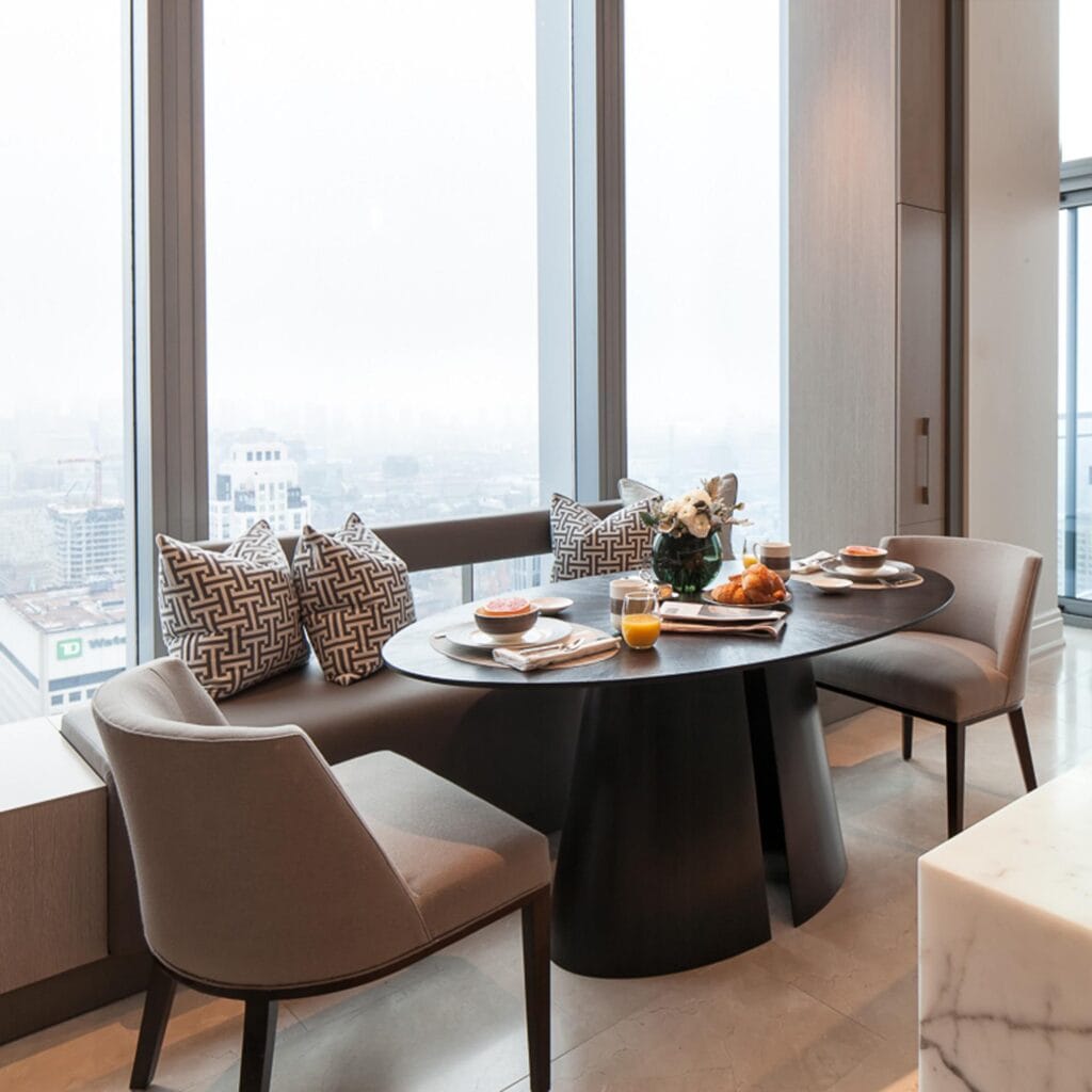The Alta Rectangular Dining Table, available at South Hill Home Toronto, features elegant bronze base and a brushed walnut finish in a range of tones. Customize with light, medium, or dark bronze details for a refined dining statement.