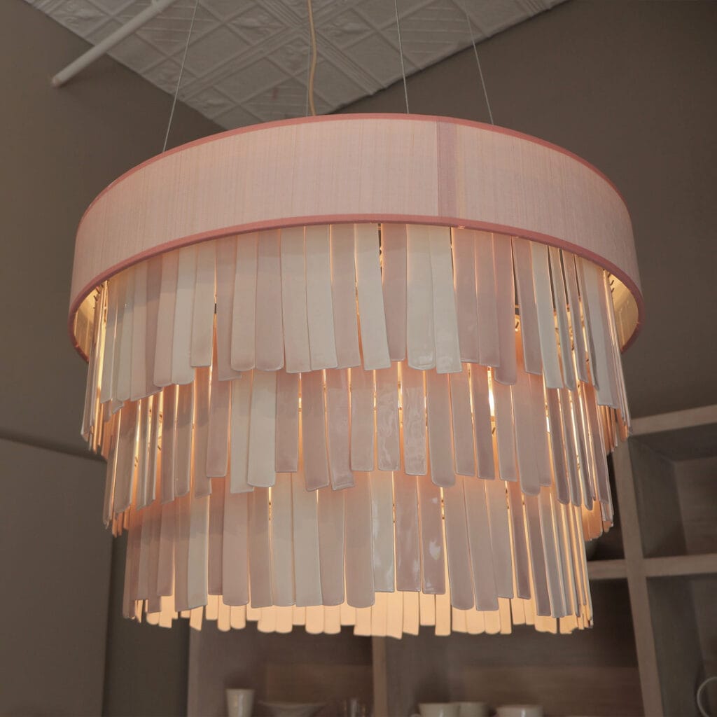 The Aquarelles round chandelier features a horsehair shade with hand glazed porcelain drops in sky, celadon or coral.