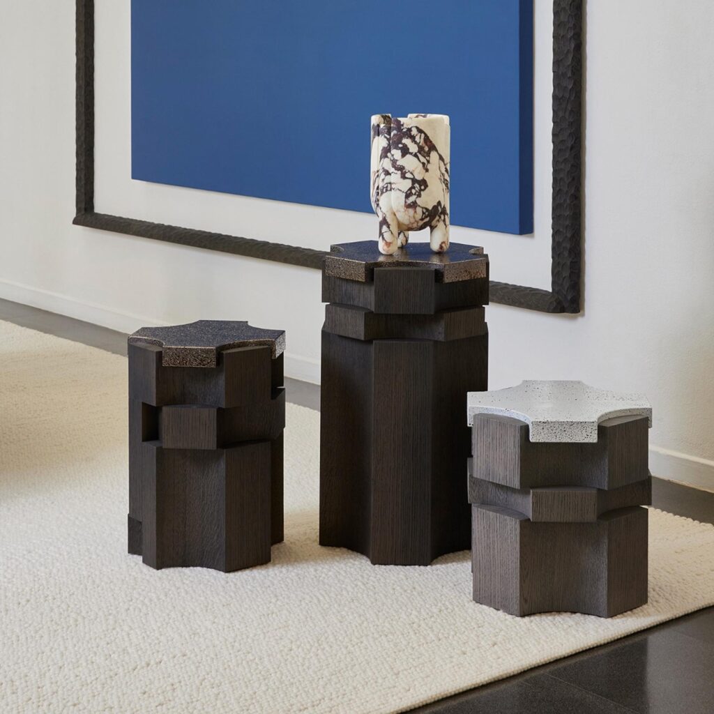 ARA is a collection of plinths/ pedestals composed of a base in brushed oak and a tabletop in enameled lava stone. ARA is a sophisticated and erudite building game, an architecture formed of solids and voids and defying the rules of geometry with interlacing of sharp edges and curving forms.