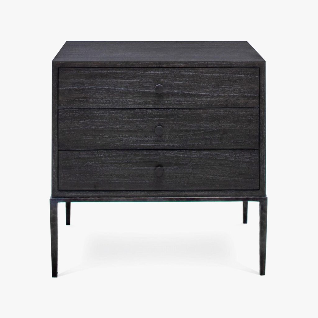 A three-drawer cabinet with applied finish veneers,sand cast brass base and handles, available in a selection of finishes.