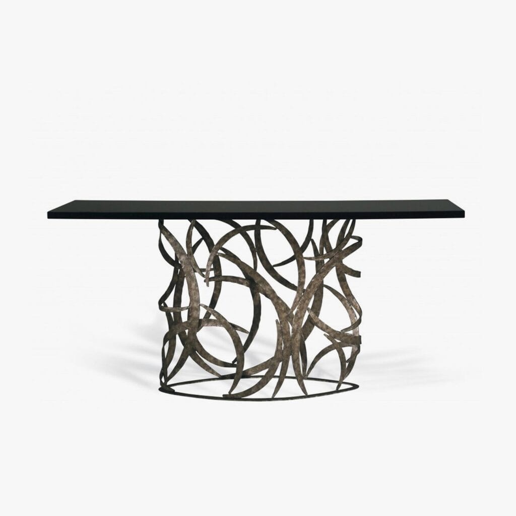 The Canopy Dining Table has a Base with an asymmetrical shape, giving the table a cantilevered look that changes depending which angle you look upon it. It is paired with a Brazilian Chestnut top.