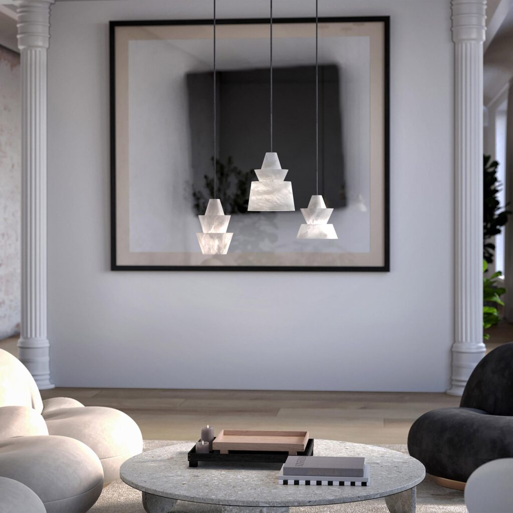 The Chamont Lavalier is machined by hand from solid brass. The round rods of the two arms transform seamlessly into its square spine at each corner. A lead crystal cylinder, with hand carved details, sits along the spine.