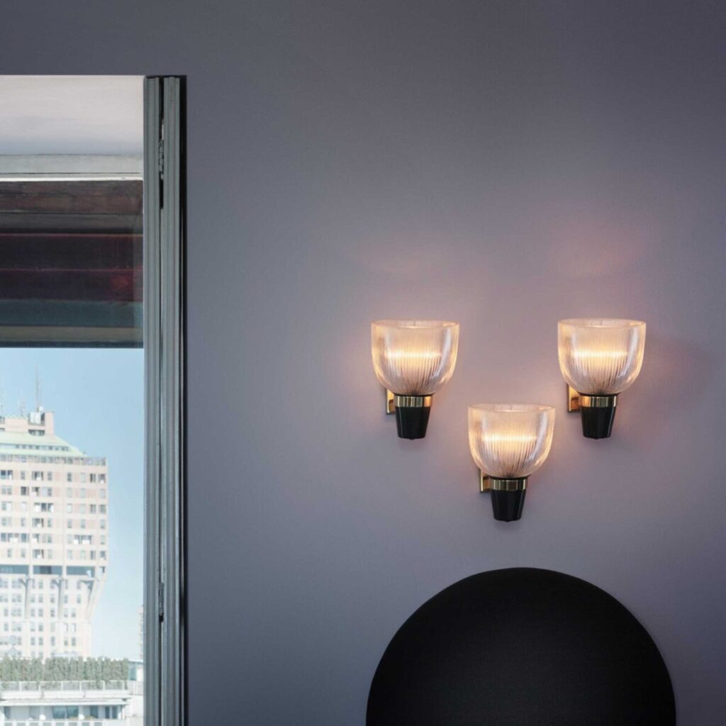 Coppa Aperta applique designed by Ignazio Gardella and Corrado Corradi Dell'Acqua, 1954. Coppa Aperta embodies the Milanese design cleverness of the 1950s. With a simple industrial glass, used to illuminate the old trams of the city of Milan, the two designer friends created a timeless piece, capable even today of evoking memories of happy and carefree times aboard the convoys running noisily through the city streets. The prismatic diffuser, supported by a brass structure, allows the distribution of light wires to the room, creating soft and domestic atmospheres.