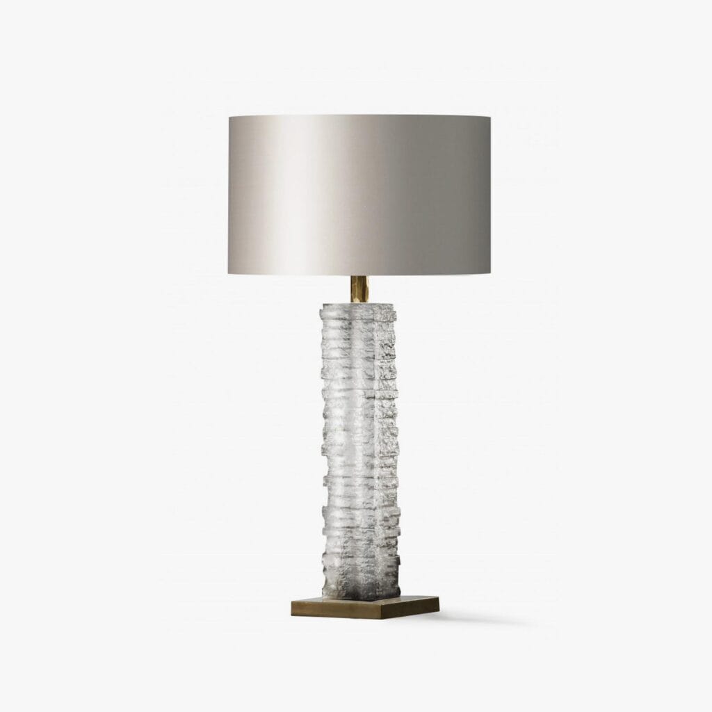 The Crystal Strata Column is constructed from one block of cast glass, with each one weighing over 10 kilograms. The Crystal Strata has a frosted texture that catches the light to give off a diffused glow and sits on a Nickel or Brass base.
