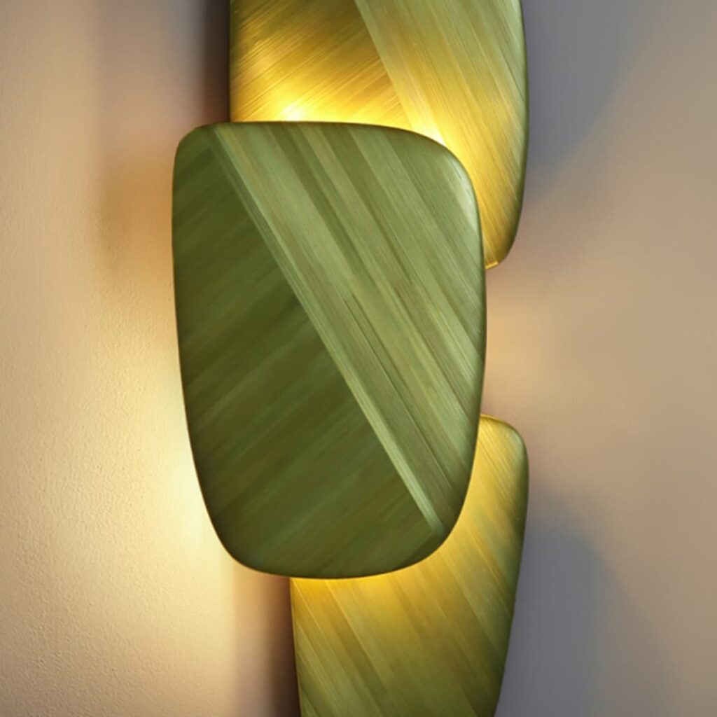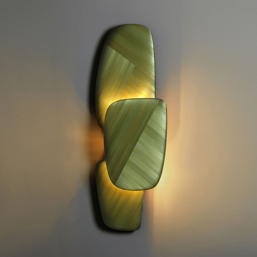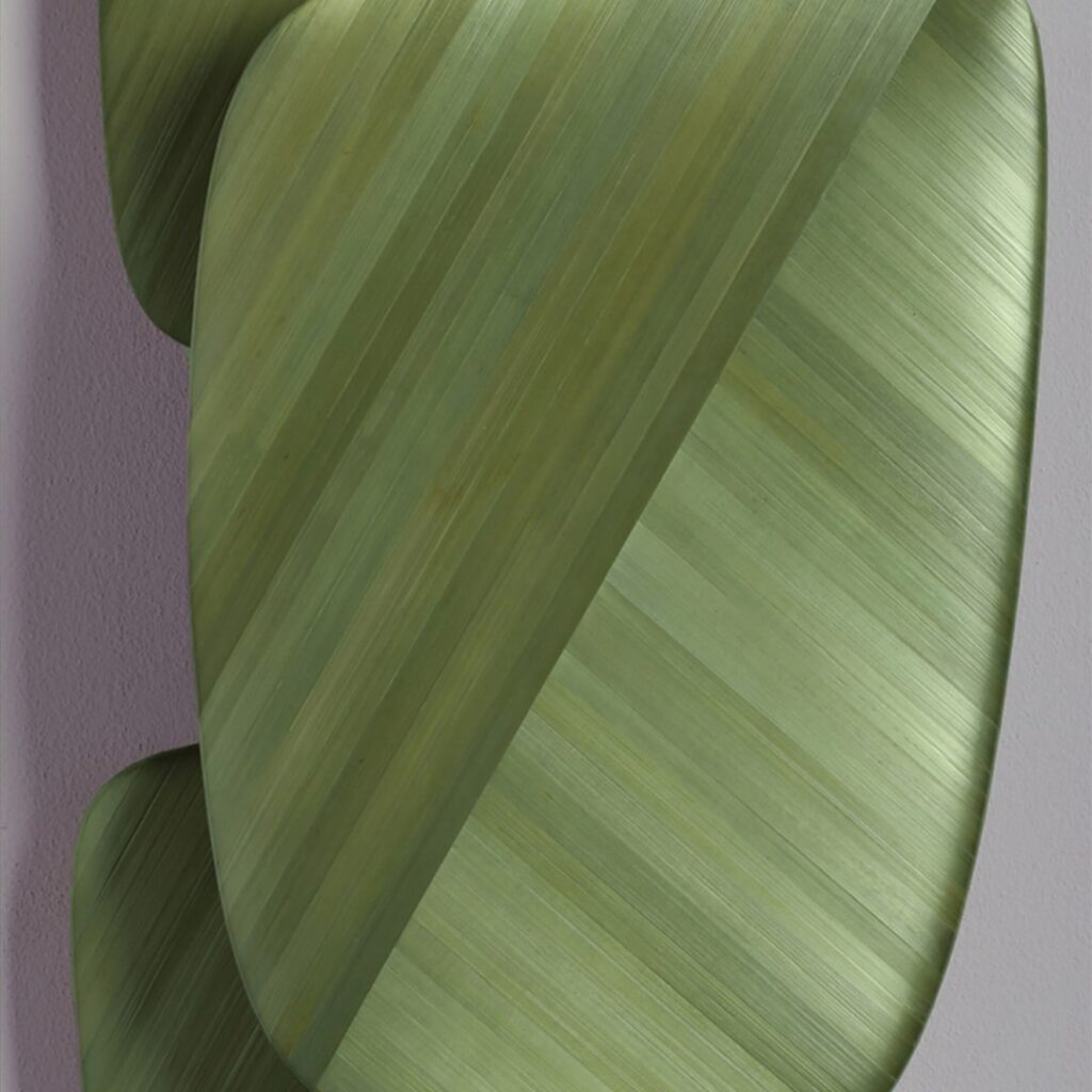 Evoking the movement of the sun across the equator, curvaceous forms in straw marquetry provide a perfectly crafted and toned foil for light, as both wall sculpture and lighting element. Intercrossing and intersecting lines of saturated straw cover rounded shields that animate the light, creating a dynamic sense of movement.