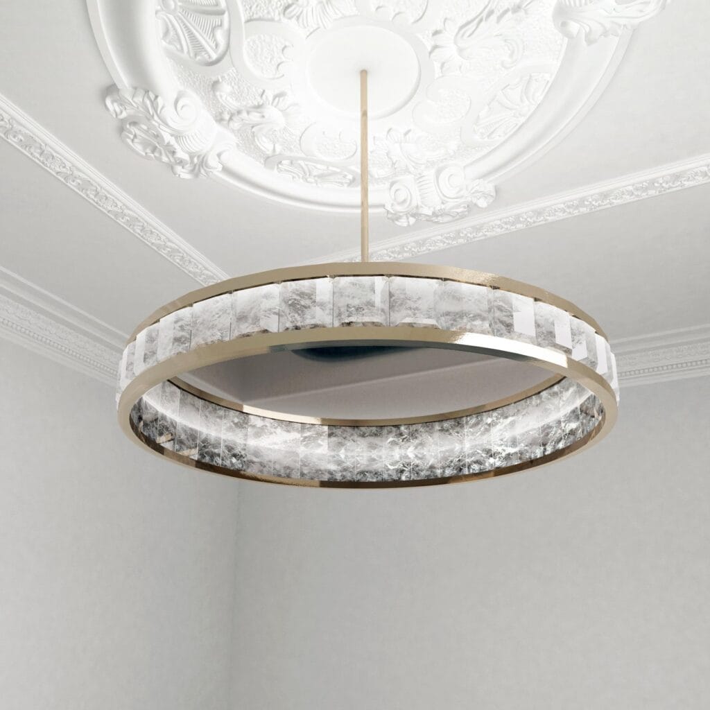 The ERATO collection is a contemporary reinterpretation of the candelabra bracket - the alabaster replaces the candle inside a patinated brass structure. Available as sconces, pendants and ceiling lights in various sizes.