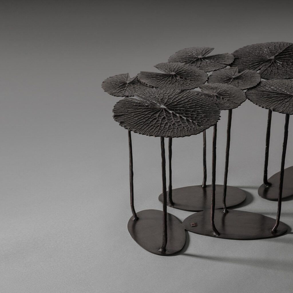 Inspired by Monet's mirror pond, water-lillies float on meandering stems. Silvered cast bronze. The tables are beautiful alone or as a pair.