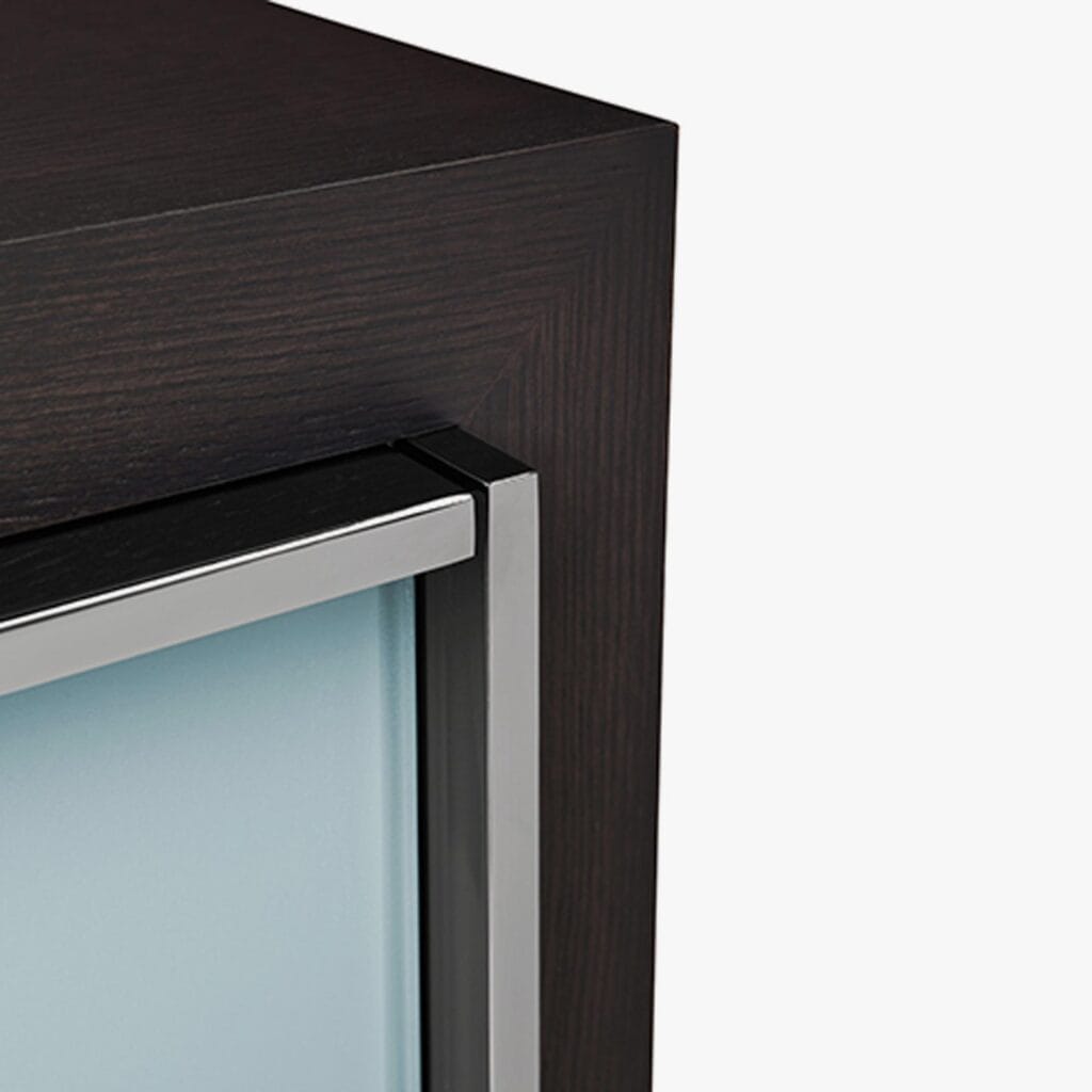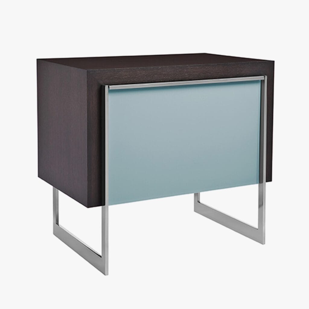 The silhouette of the Friday nightstand by Powell & Bonnell is a study in minimal design. The crisply detailed cabinet rests upon a sleek metal frame base, seamlessly integrating the horizontal linear drawer pull. The single drawer face slides out to reveal a clever drawer-within-drawer. Perfect for neatly organizing and tucking away items. Convenient. Functional. Sleek. Available in numerous combinations of wood, metal, glass/mirror and lacquer finishes.