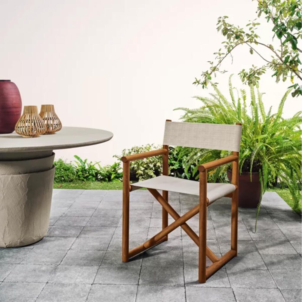 Oiled Iroko, Stainless Steel, Fabric