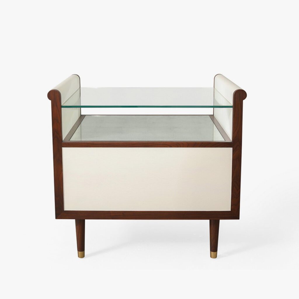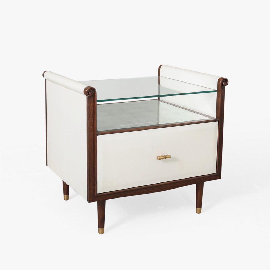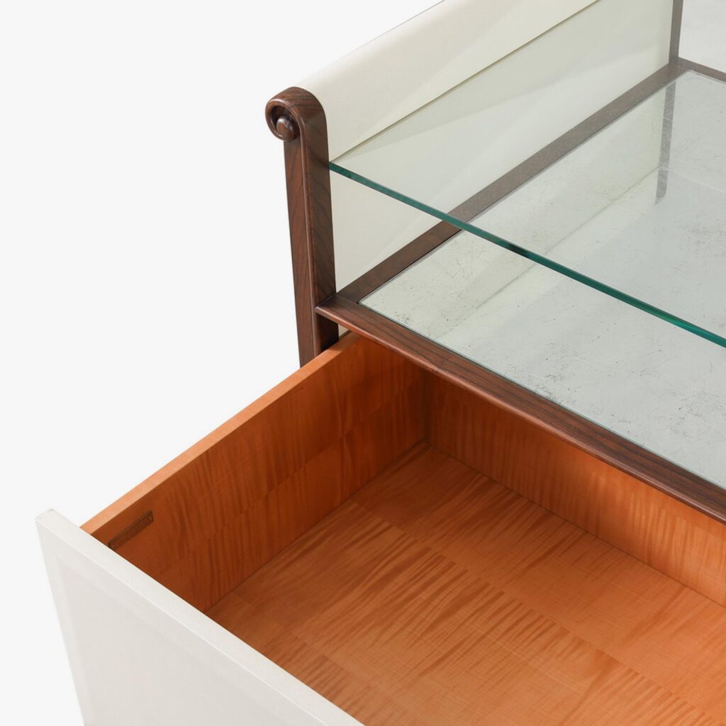 A pretty, single drawered Vellum clad bedside table with Rosewood legs and Aged Brass detail. The Hepburn Bedside by Julian Chichester has a top with scrolled sides, which supports a toughened glass top that rests above an Verre Eglomise insert.