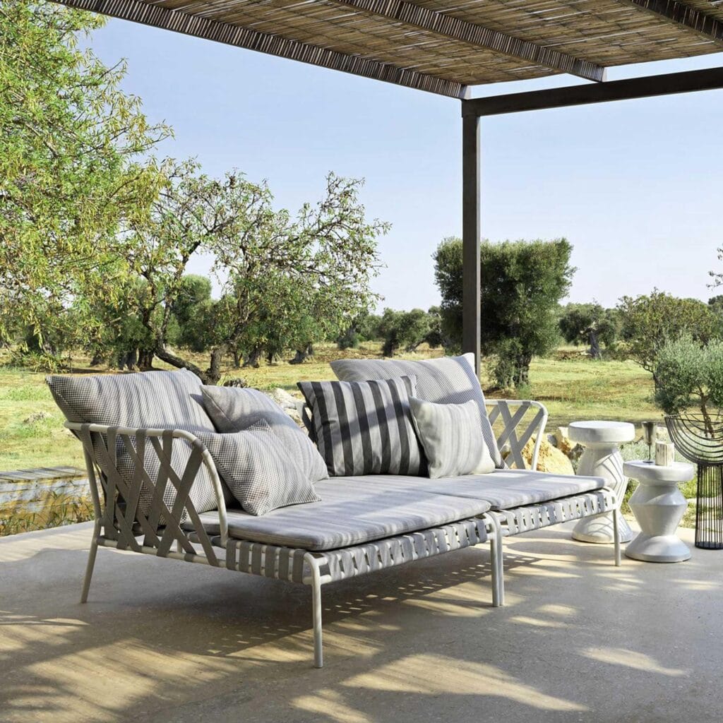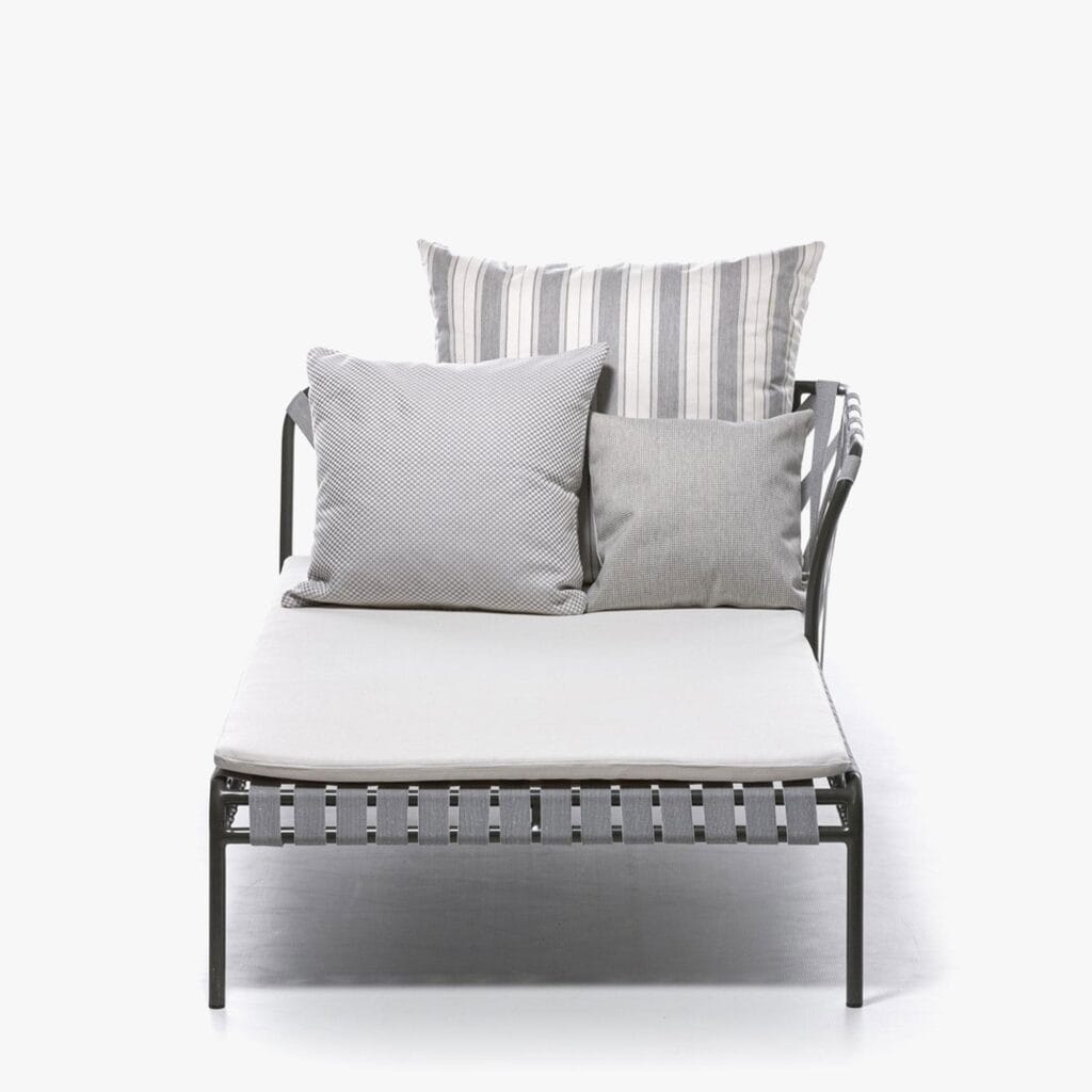 Daybed, one right or left armrest, matt white, grey or sage lacquered aluminium tubular frame, woven with blue, black or grey elastic belts. Cushions with removable covers.