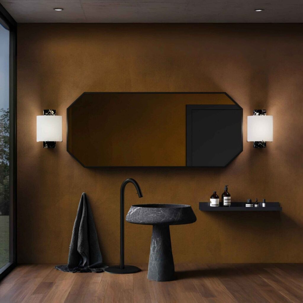 Designed by Matteo Nunziati, the Lea applique pairs geometric cylinders with a satin polycarbonate shade and a base in Marquina, Carrara, and Portoro marble.