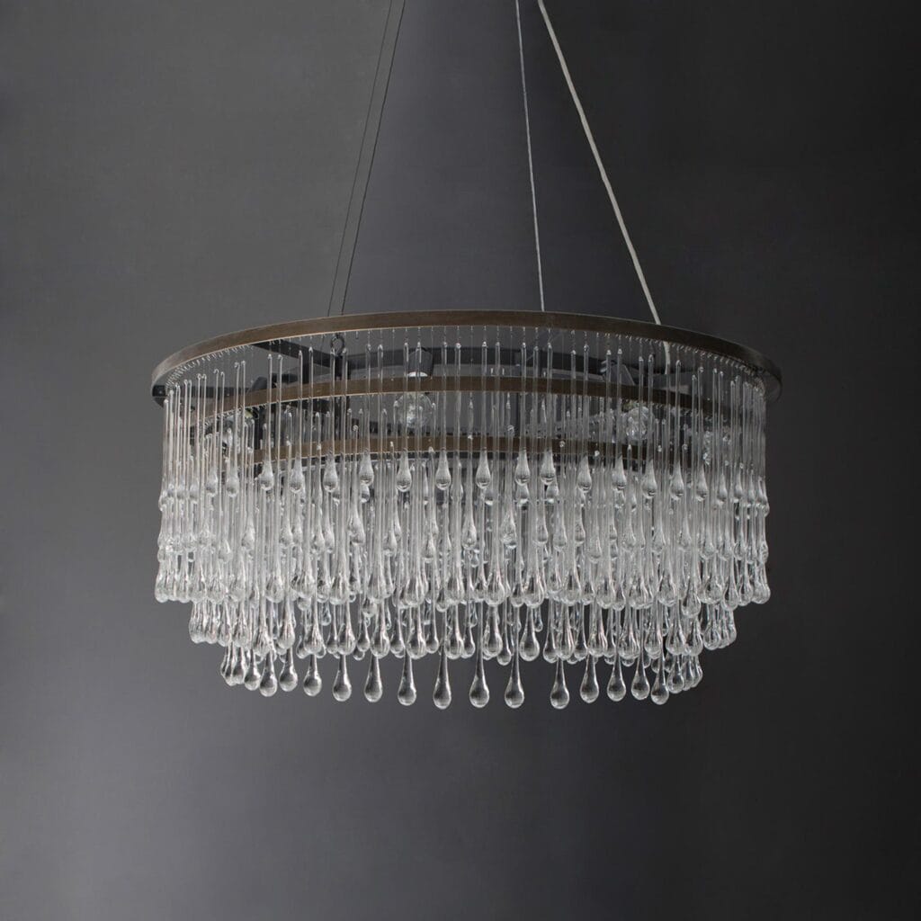 The Light Drizzle round chandelier available in nickel or patinated bronze finish with solid clear glass drops.