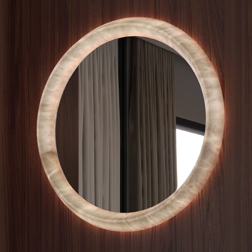 The LUCY A mirror is elegantly set inside a luminous alabaster circle. Its round, backlit design will make it the perfect element above your bathroom sink, over your bedroom dresser, or as a centrepiece in your living area.