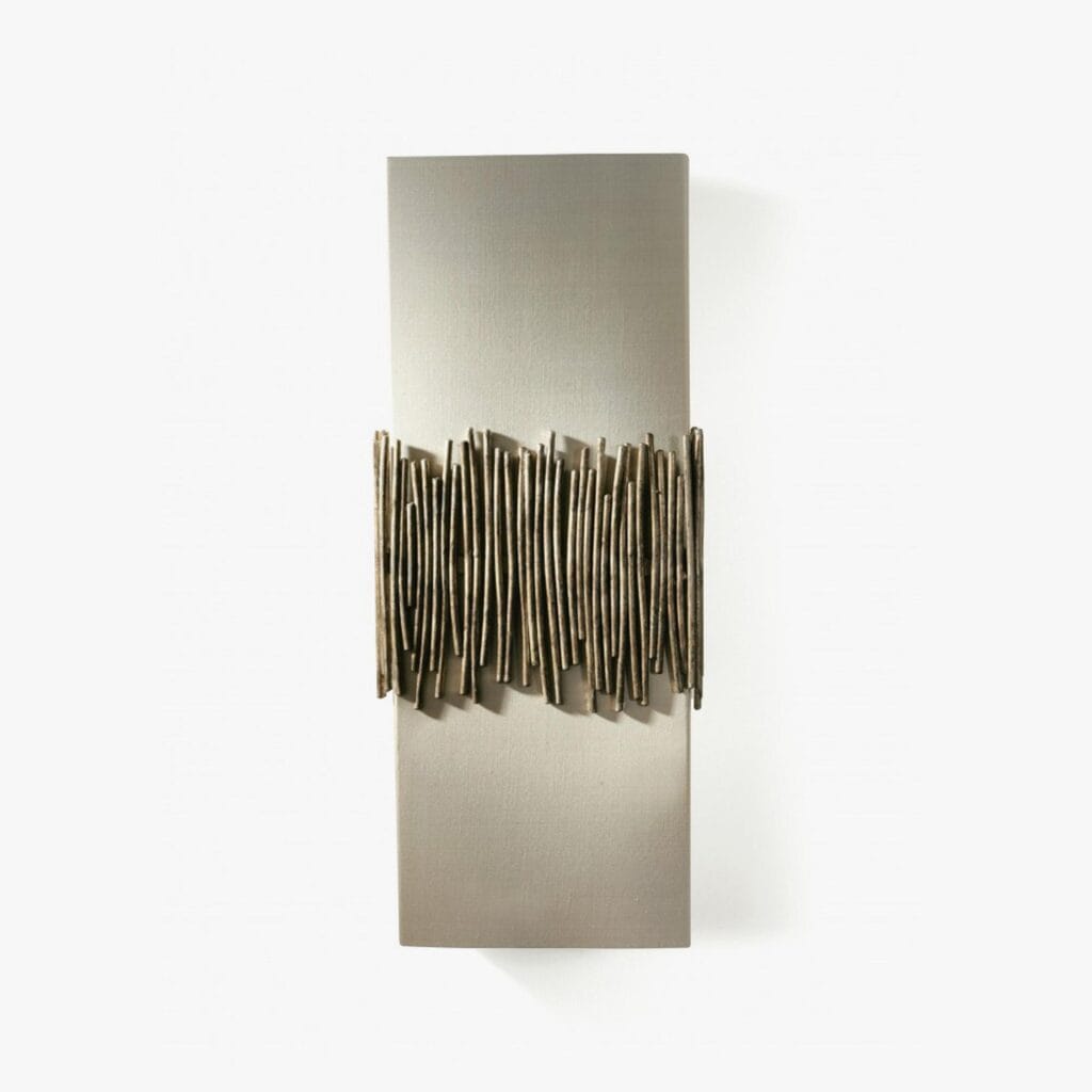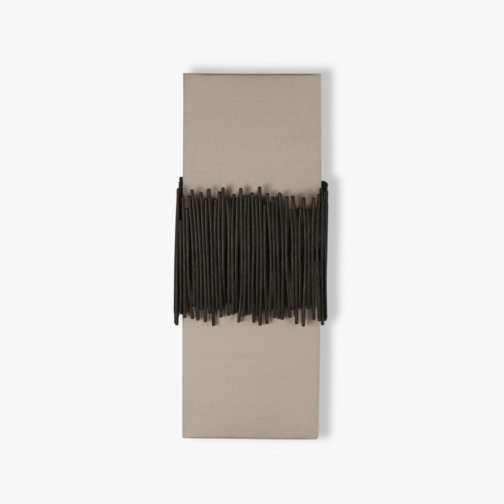 Over 70 pieces of hand cut and twisted metal bars are joined together to create this very sculptural wrap-around frame for a silk shade. Each piece will be made to a precise outside dimension whilst having a uniquely hand made collection of individual elements, ensuring that no two pieces will ever be entirely the same.