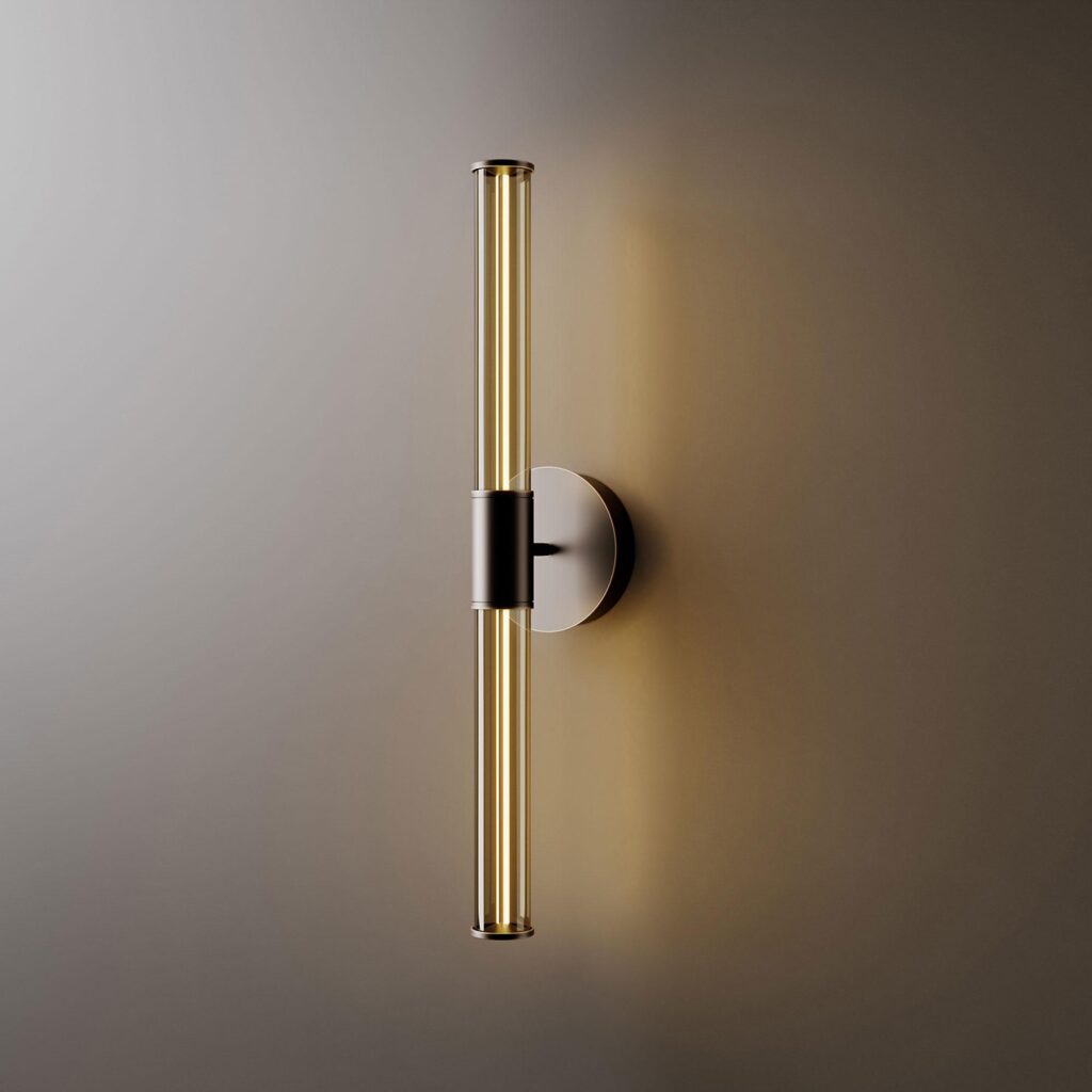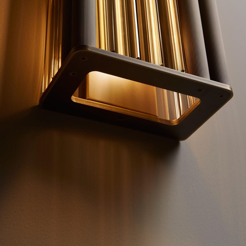 Numa Wall in a dark burnished brass structure with crystal, amber or smoke grey murano blown glass trihedrons.