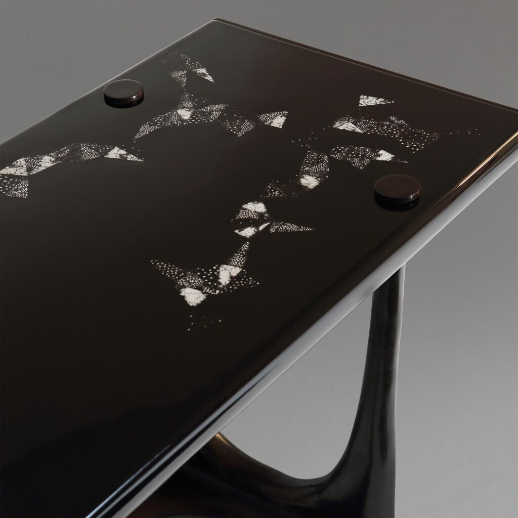 The Orpheus Console is patterned with a dance of eggshell triangles inlaid into black lacquer. Six sinuous lost-wax bronze legs stretch beneath with bronze caps on the top surface. Bronze also finishes the table ends.