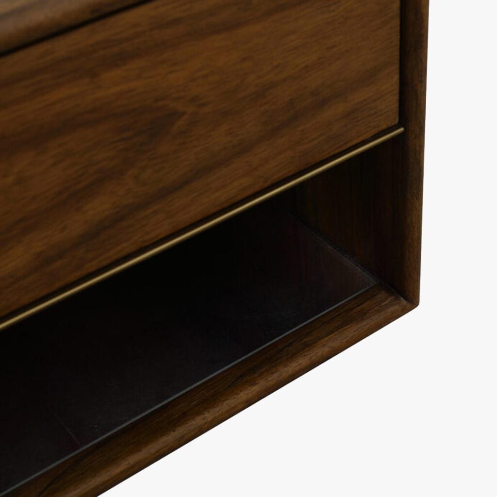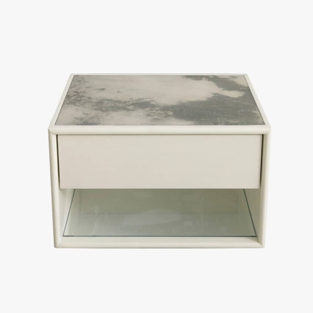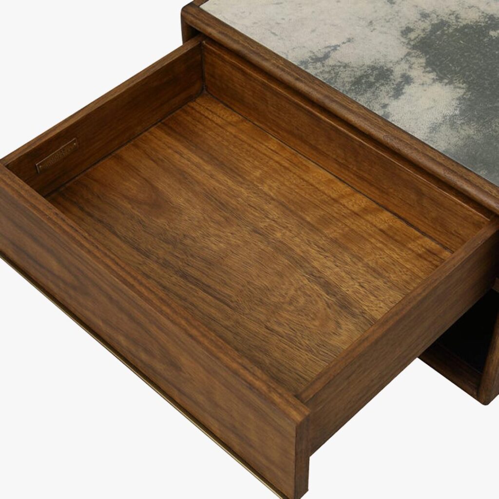 A small-scale, wall-mounted Bedside Table. Crafted from African Walnut or Off White High Gloss Lacquer, and featuring a High Gloss Jade Vellum top, this bedside table includes a single drawer adorned with Aged Brass accents, along with a beautiful Eglomisé lower shelf.