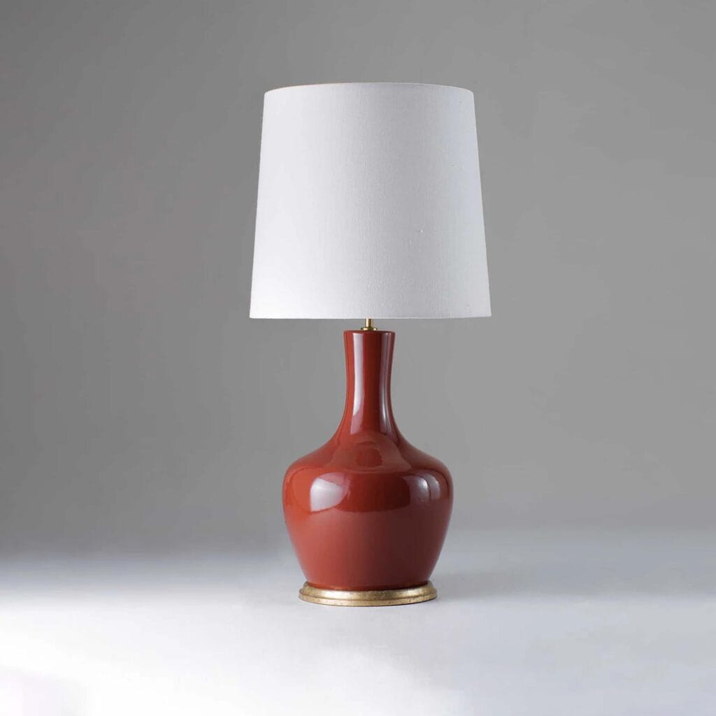 The Rigby Lamp was designed as a classic ceramic lamp with a short neck and a rounded body. Its gilded base provides a contrast to the brightly coloured glaze of the ceramic.