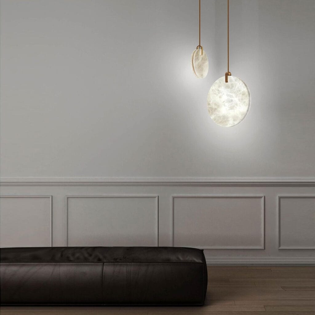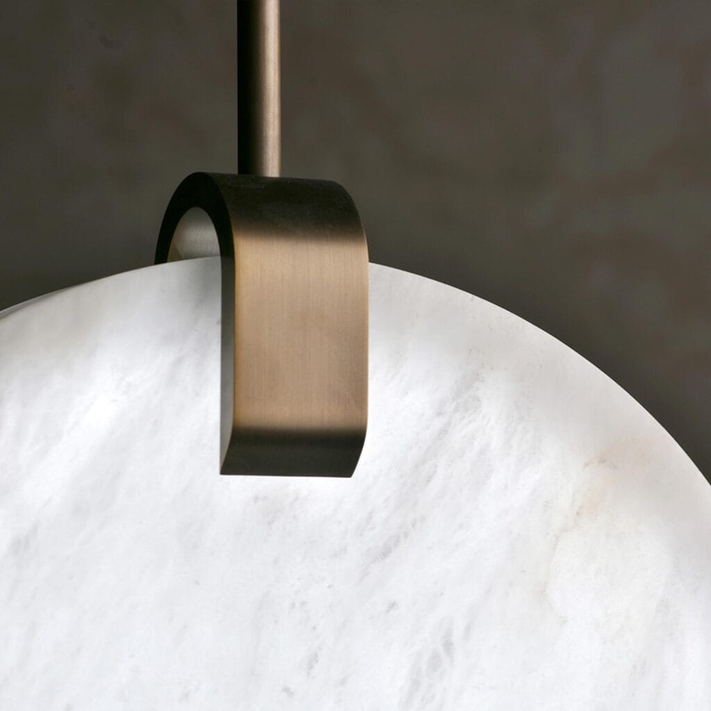 Two discs held together in a vertical suspension. The union of these shimmering twins, joined by a subtle metal interior ring, mixes cohesion and originality to the whole composition.