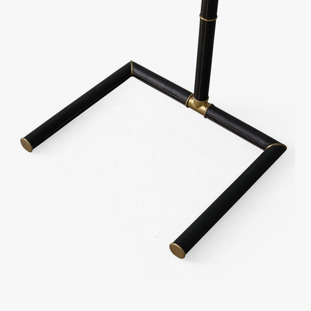 A pair of nesting tables with Dark Smoked Oak tops that sit on hand stitched Black Leather legs with Aged Brass detail. The Square formed U stretcher gives great stability.