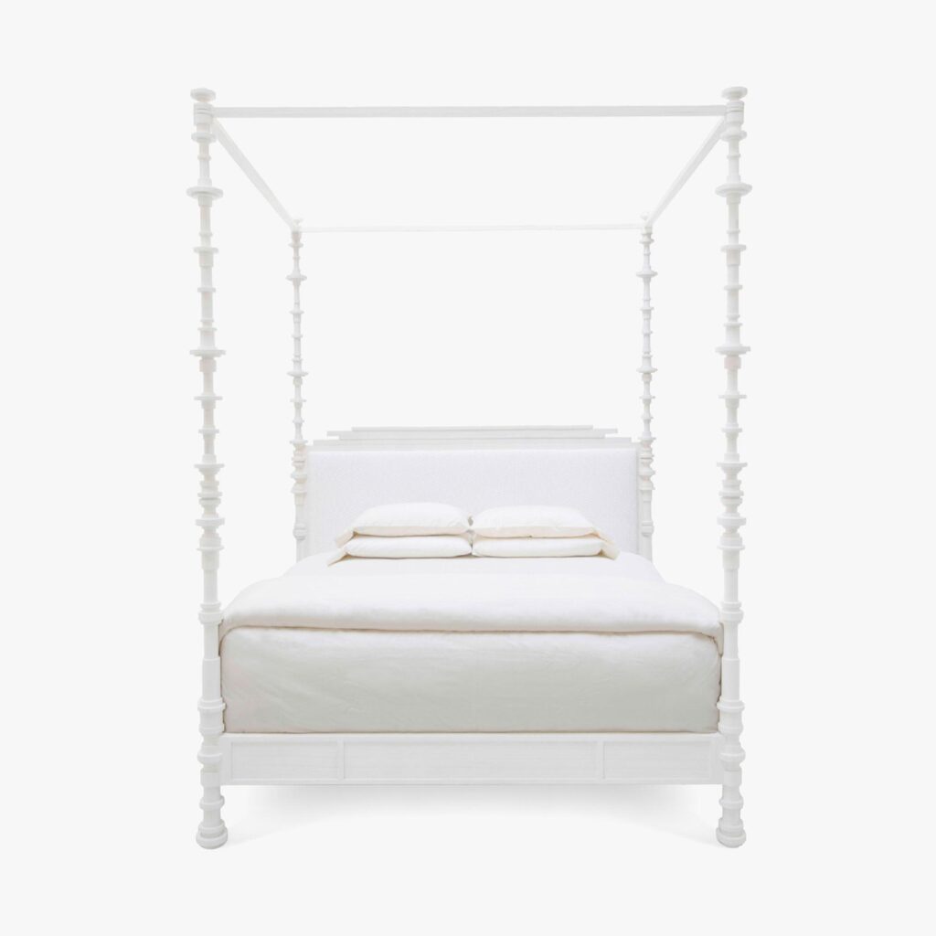 A bed made with sculptural, modern silhouette with tiered, turned wood posts, available in a selection of finishes.