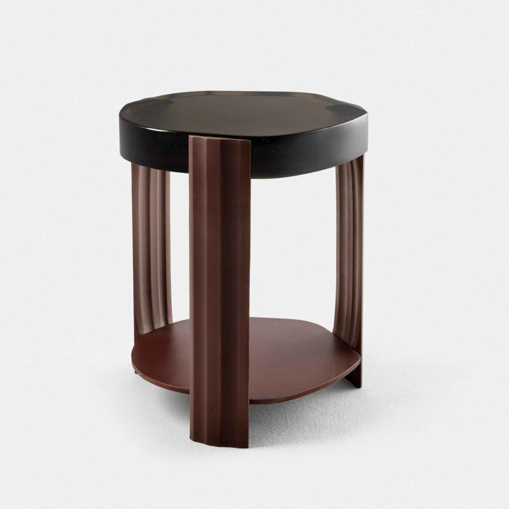 The Tributary motif is about headwaters and braided streams and also about the nature of tribute, the channeling of materials and processes into something contributory. The works are anchoring, monumental, and express movement between elements both navigable and rough, high plateaus and shallow estuaries. The Tributary Occasional Table is an exploration of these planes, channels, and primary and secondary surfaces. The cast bronze frame and lower surface together support hand-polished kiln cast glass, solid oak, or black walnut.