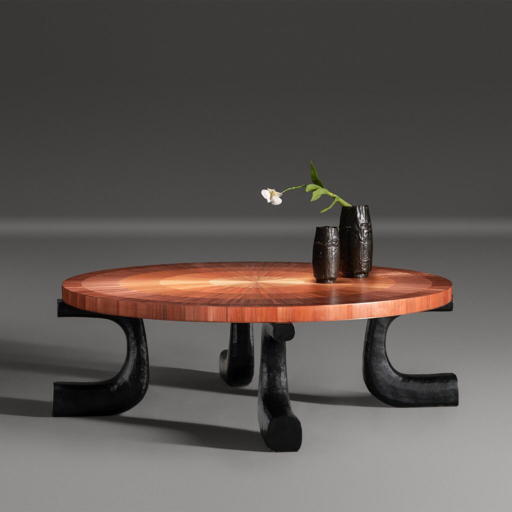 Top made of certified wood composite, veneered in wood, available in a matte, satin, or glossy varnished finish with patinated brass details. Legs made of solid ash wood, veneered in wood, available in a matte, satin, or glossy varnished finish, with patinated brass tubing.