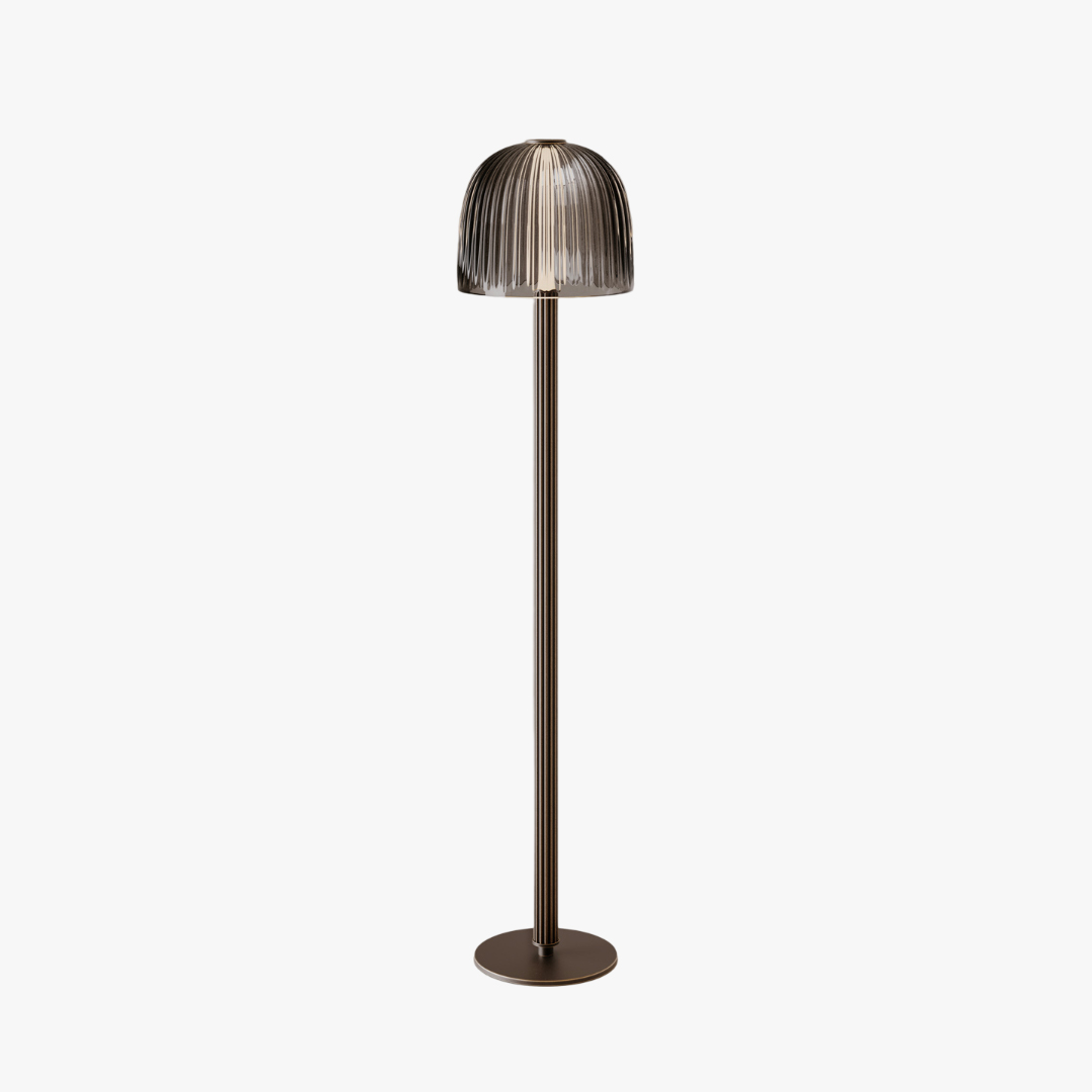 The indirect light of Augusta Floor diffuses softly, casting gentle shadows through the wavy surface of its Murano blown glass shade, available in bronze or smoke grey. The dark burnished brass structure, with its regular grooved pattern, accentuates the lamp’s slender vertical form and complements the wavy design of the glass, enhancing its sculptural presence. Augusta is also available in a Suspension version.