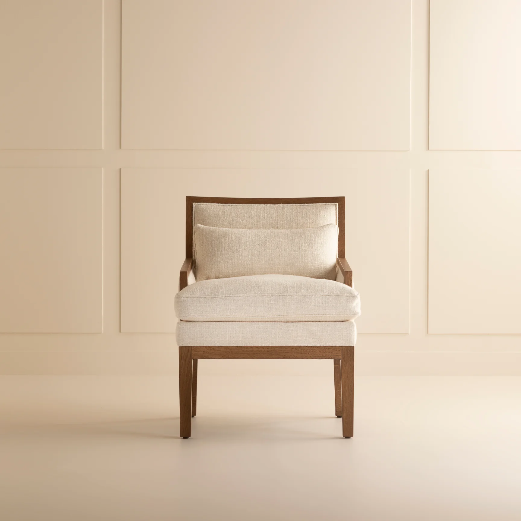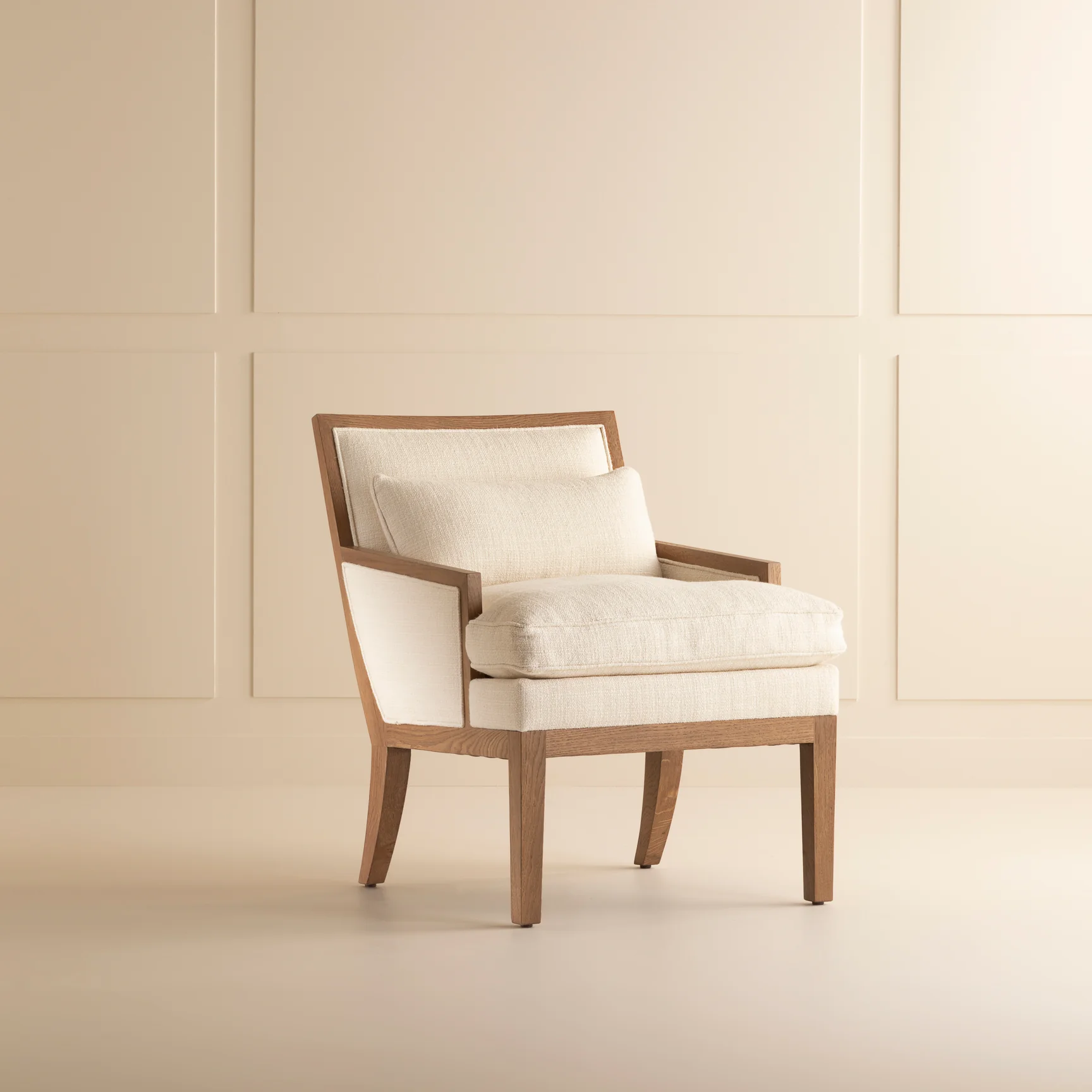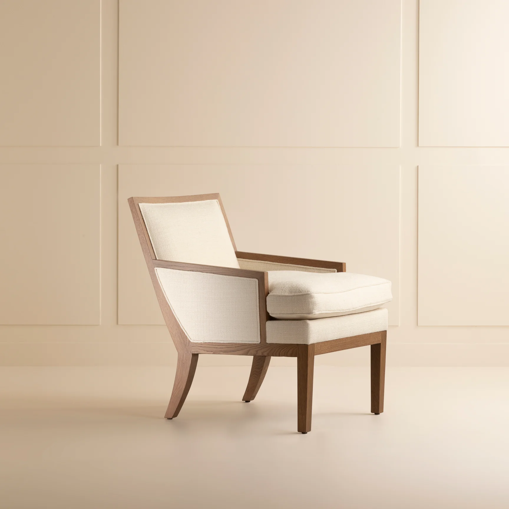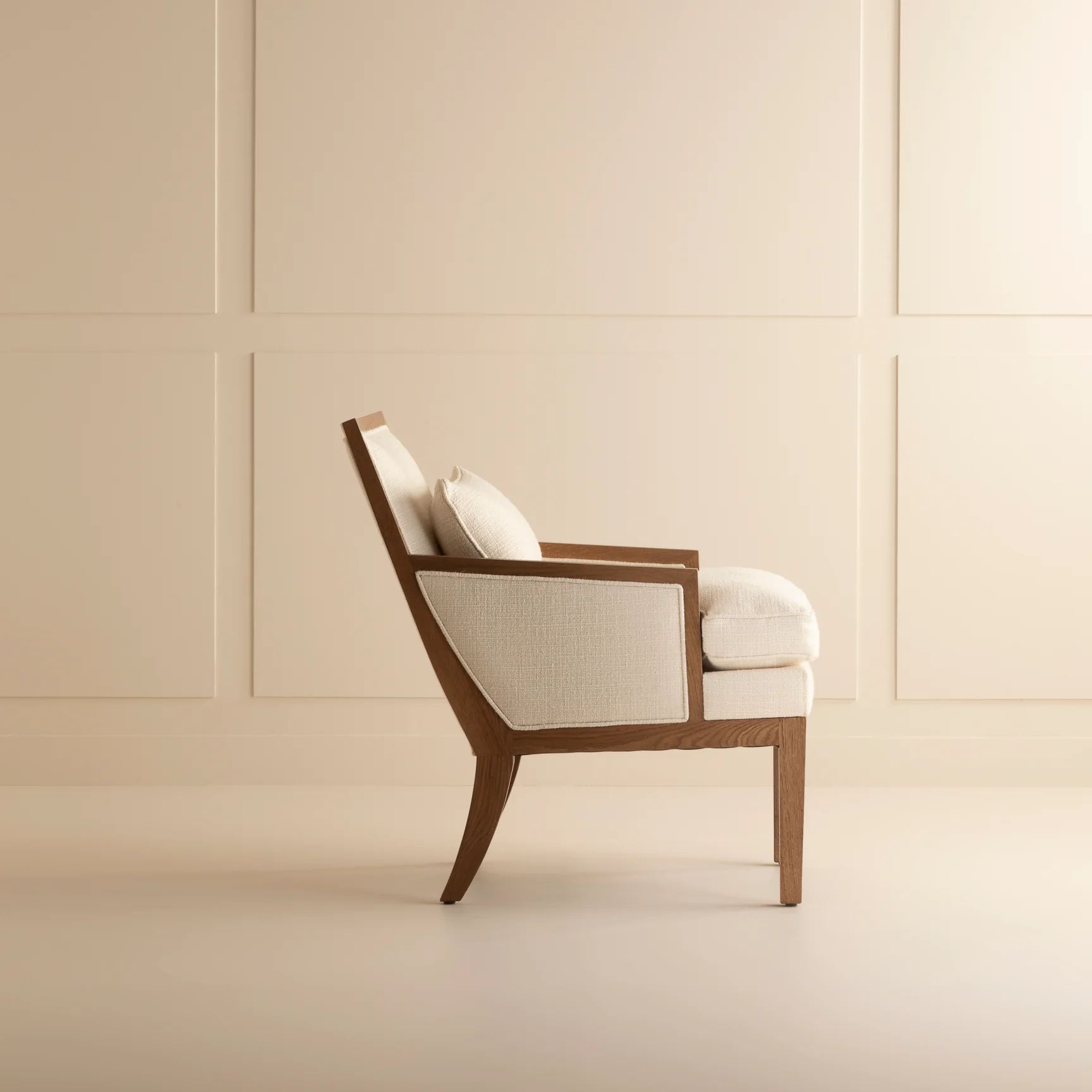 Jean-Michel Frank’s Bergère, c.1924, in varnished solid oak with fabric or leather upholstery, reflects Egyptian inspiration and timeless elegance. Featured in iconic interiors by Robert Couturier and Armand Massard.