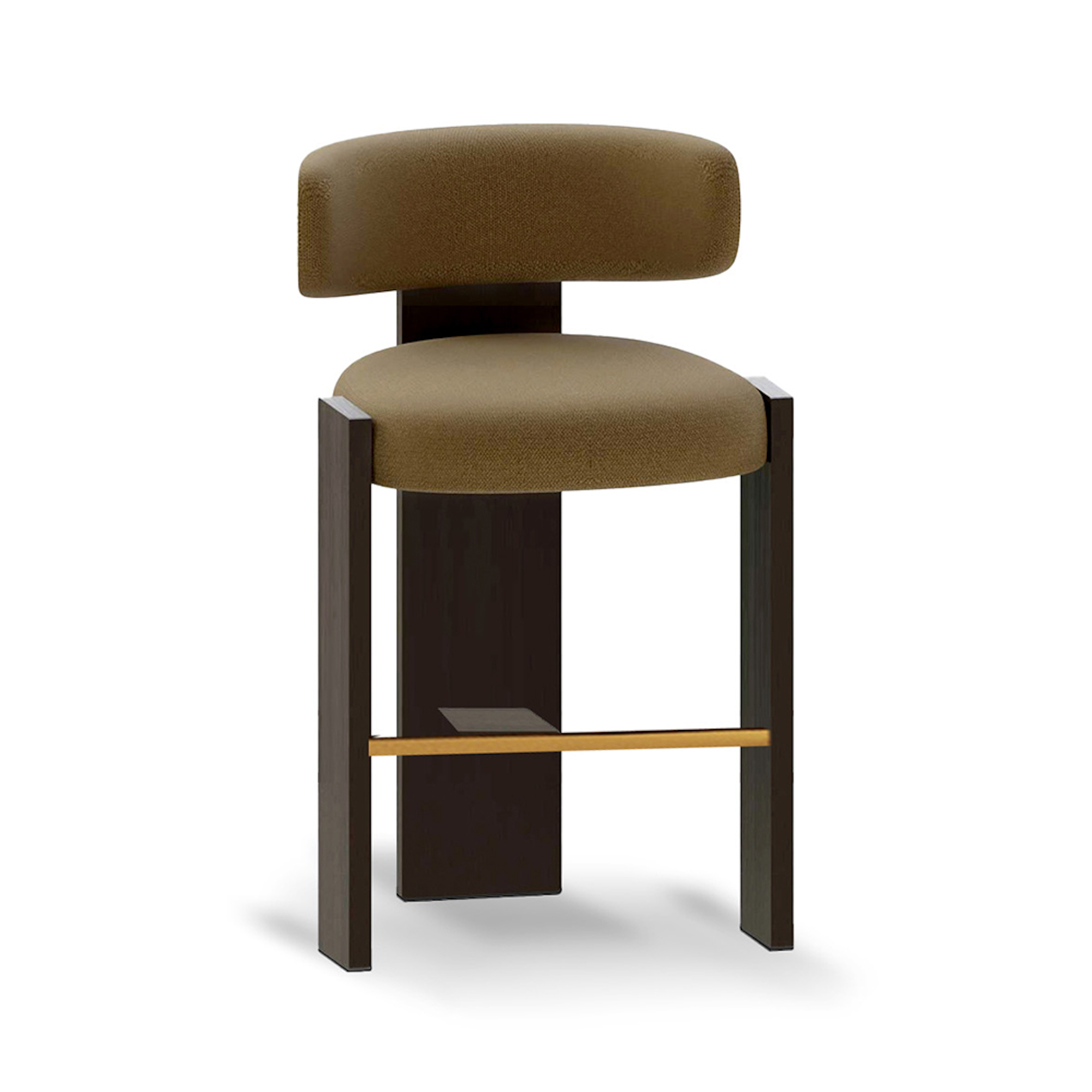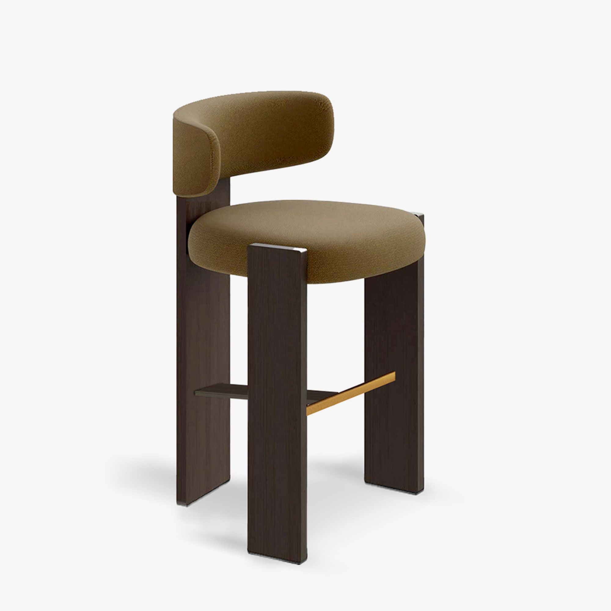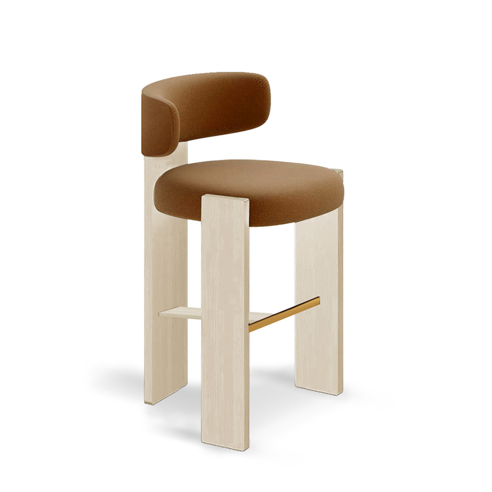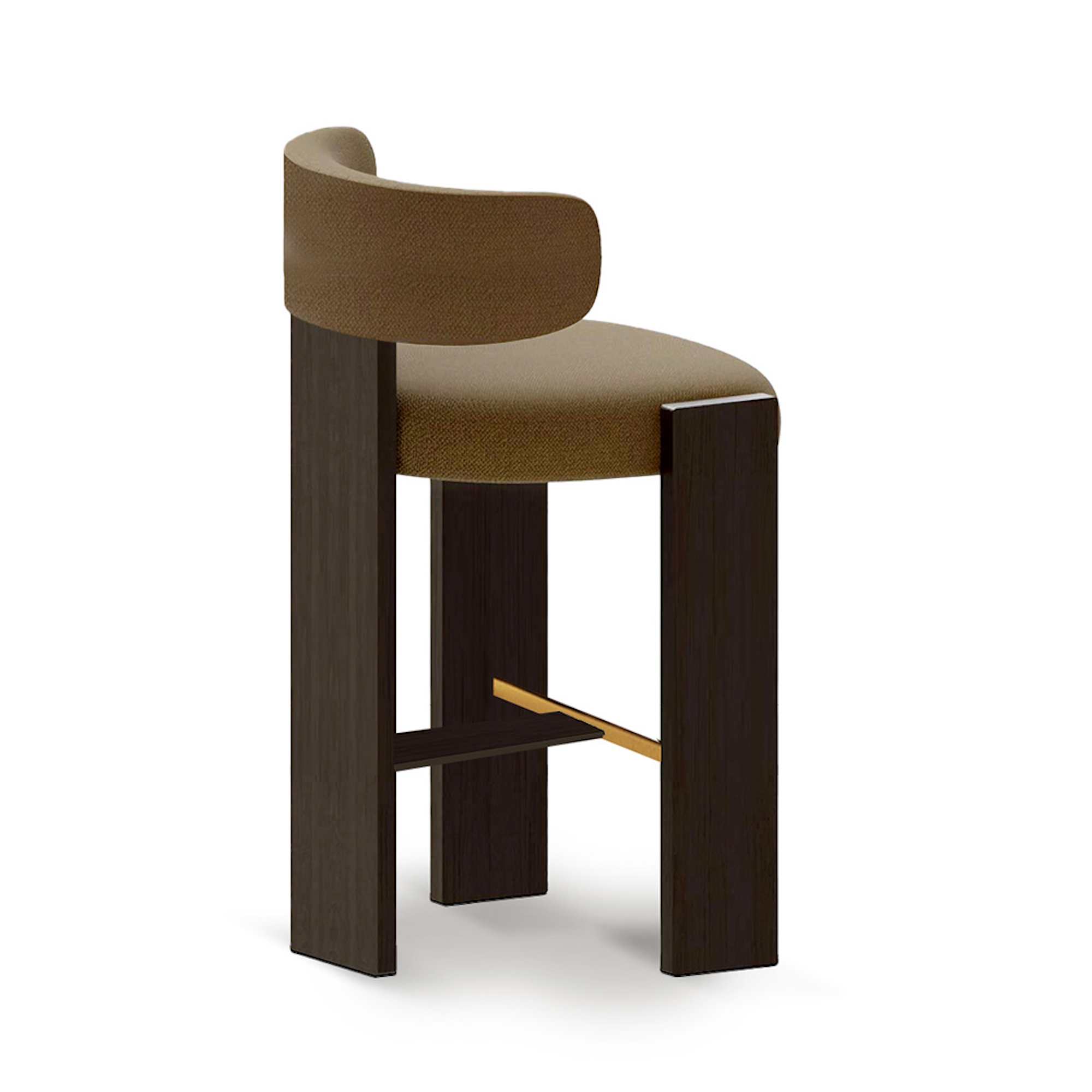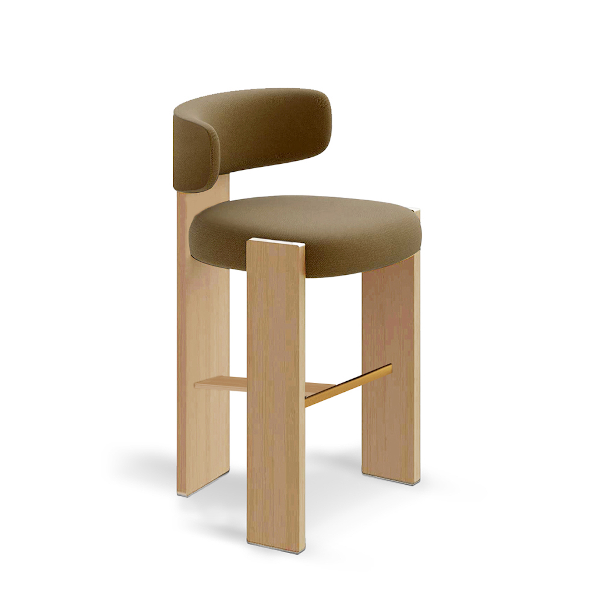 CollectorThe Core Bar Chair combines geometric oak structure with a curved upholstered back and brass footrest balancing architectural strength and modern comfort