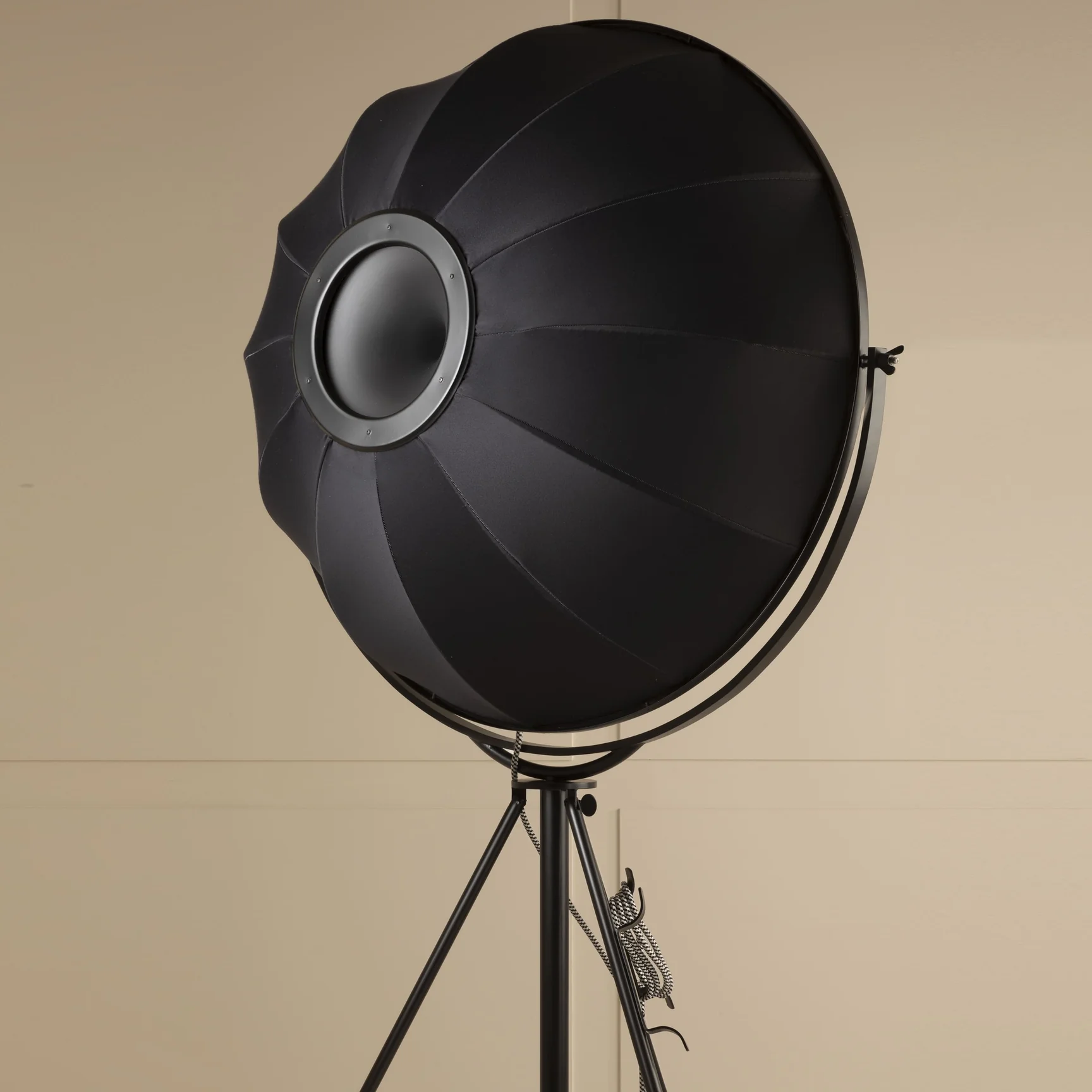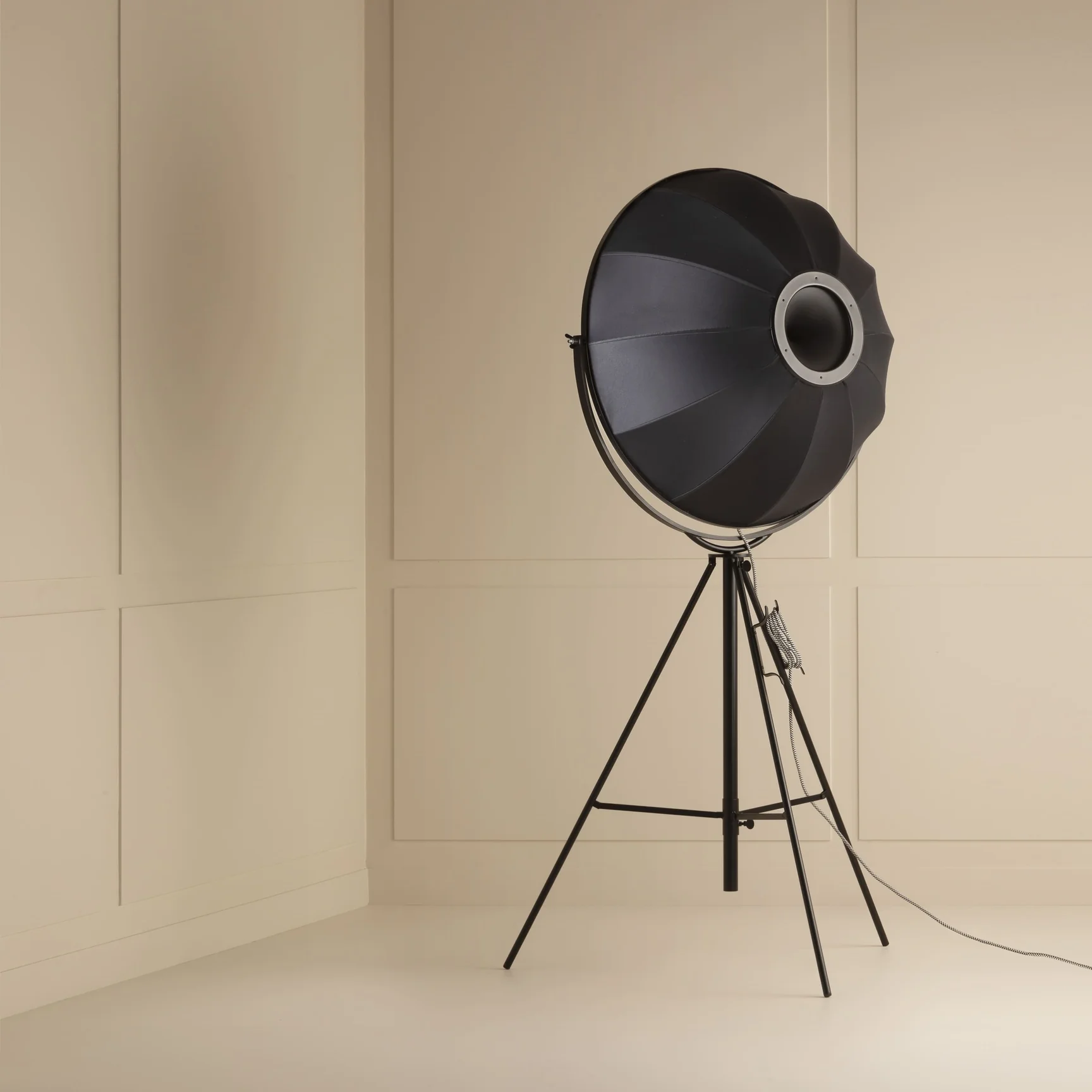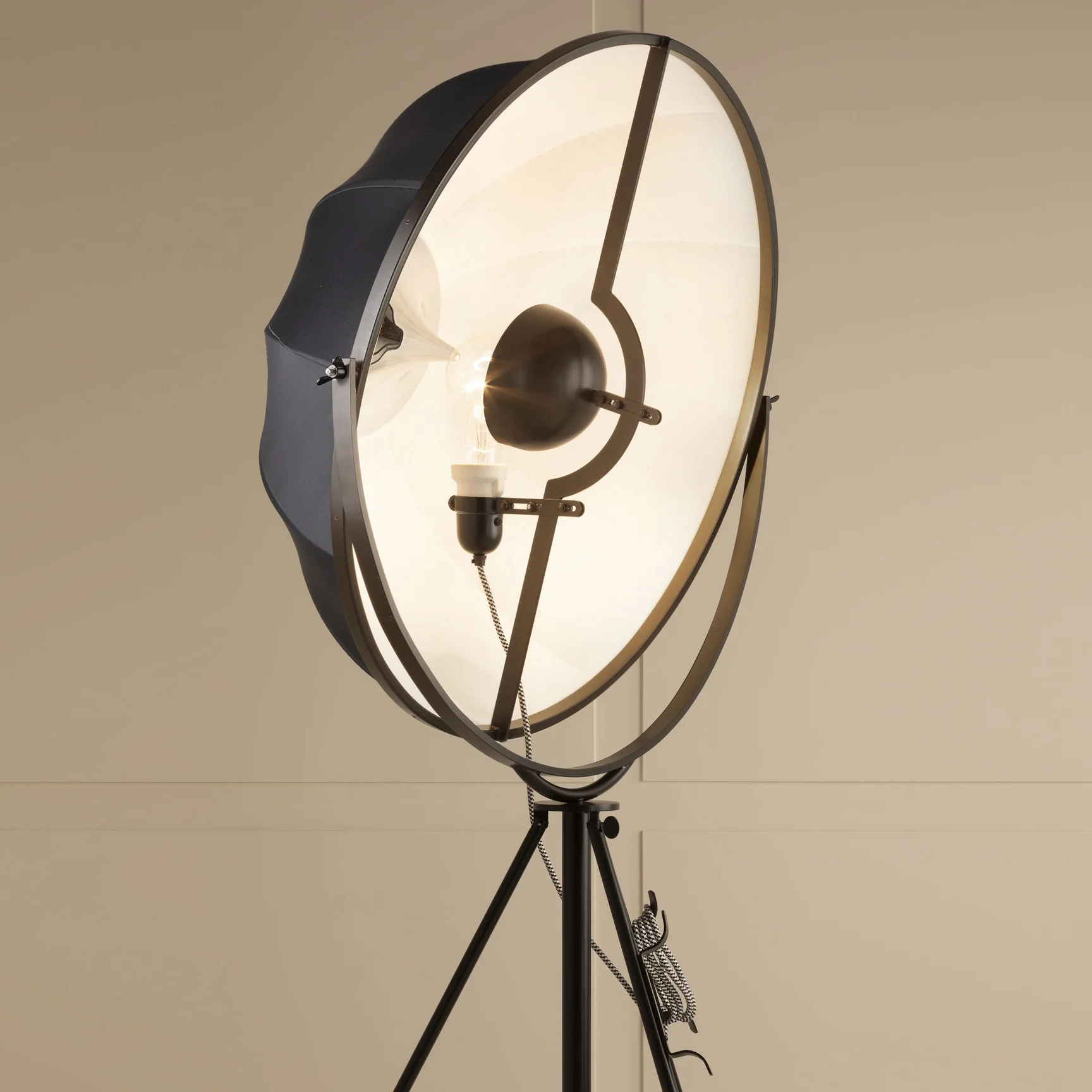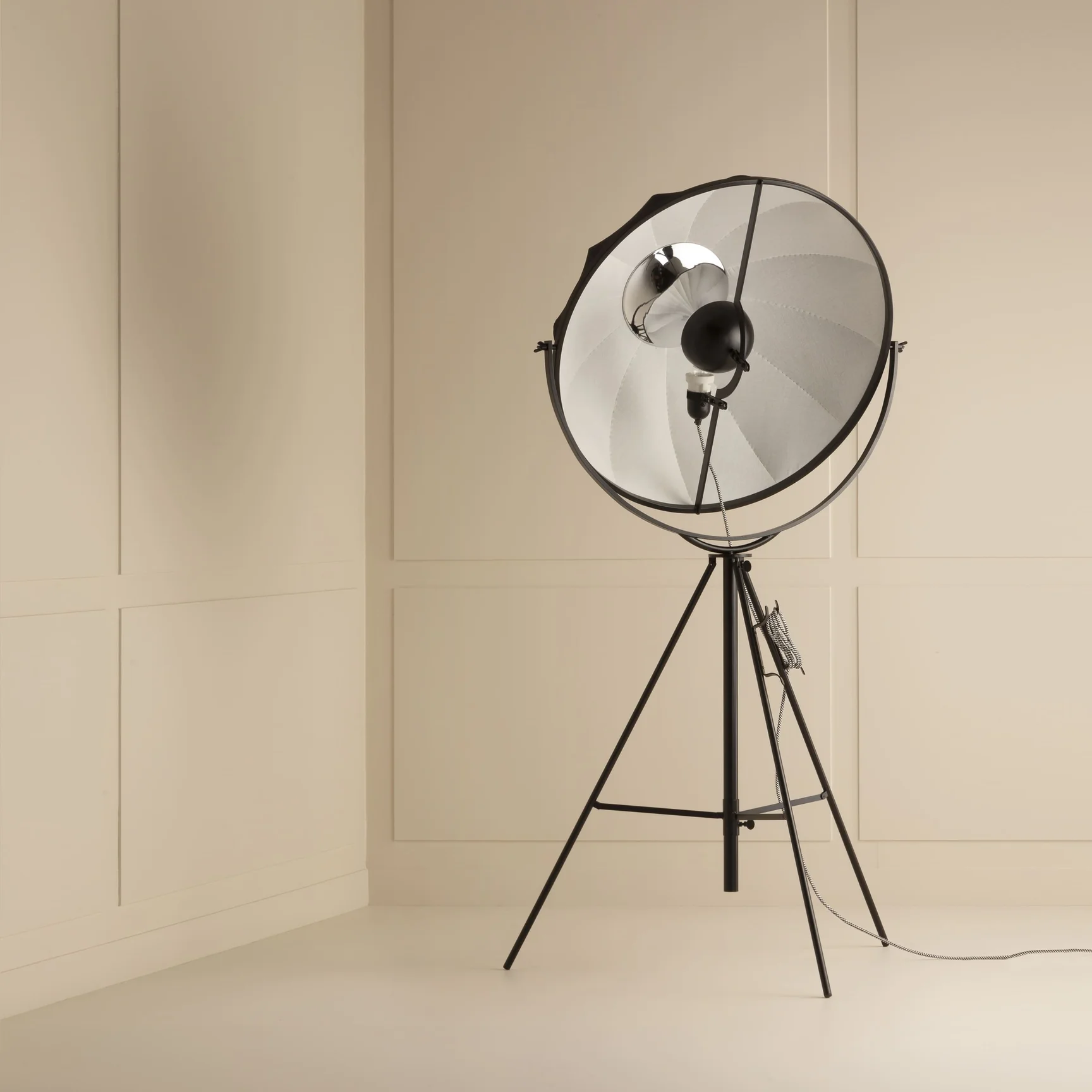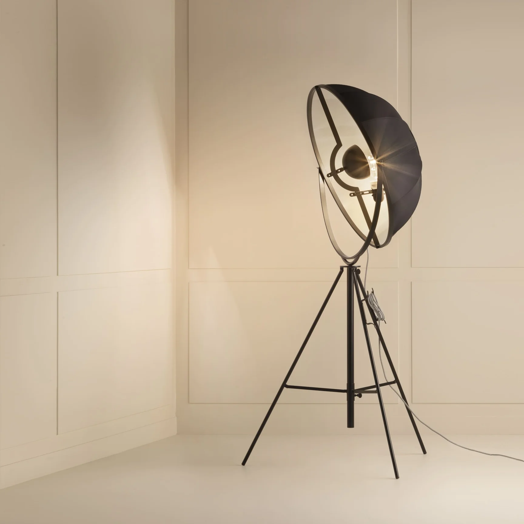 Mariano Fortuny’s Projector, c.1907, in black lacquered steel and chrome brass, reflects his research on light diffusion—an avant-garde icon of ECART’s lighting collection.