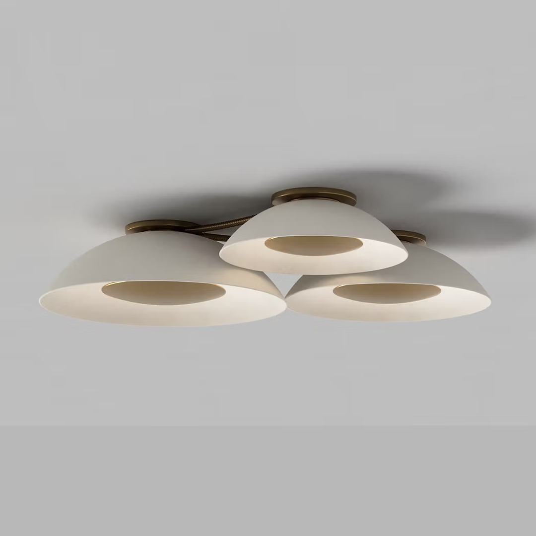 The Dome flushmount is available in four sizes from 12-inches to 22-inches diameter. The inner light "shield" can be specified as porcelain or metal, with the glaze colour or patina finish of your choice. Sets shown connected by finely braided metal cording require just one junction box.