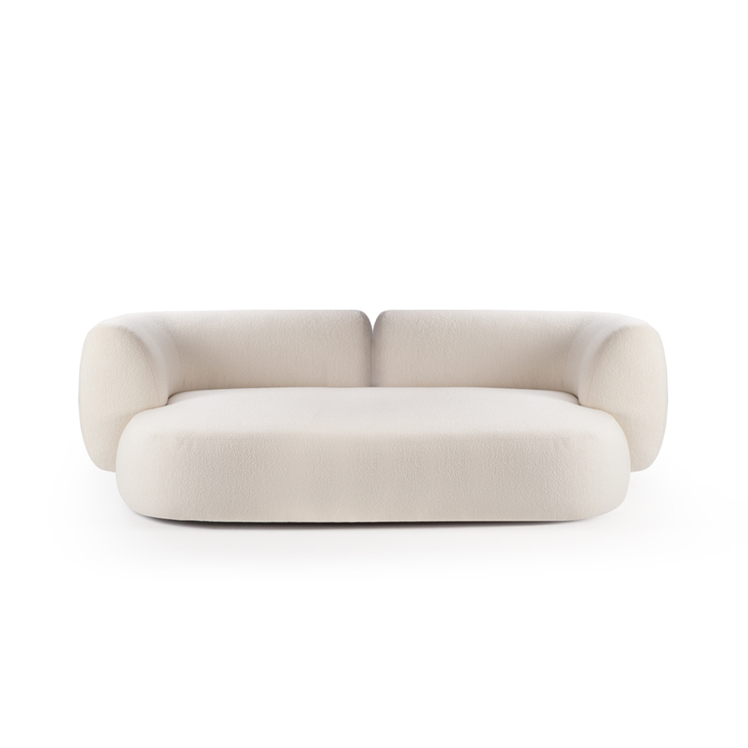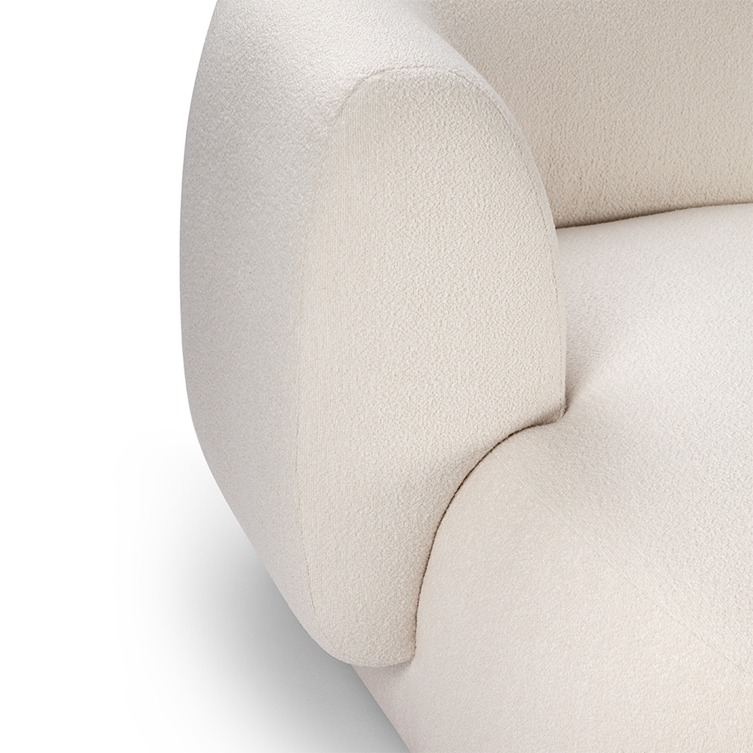 UPHOLSTERY: Exterior structure upholstered in boucle snow fabric. Interior backrest and seat cushions in fabric
