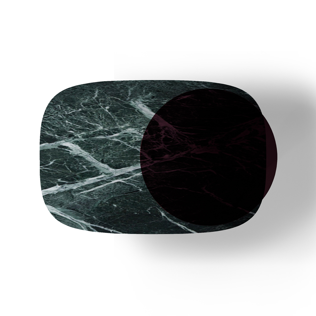 CollectorLinda Center Table by Davide Monopoli. The juxtaposition of two geometric shapes gives the Linda Side Table a different shape in each perspective. A simple combination of marble and glass creates a look of fragility that is sustained by its solid iron legs.