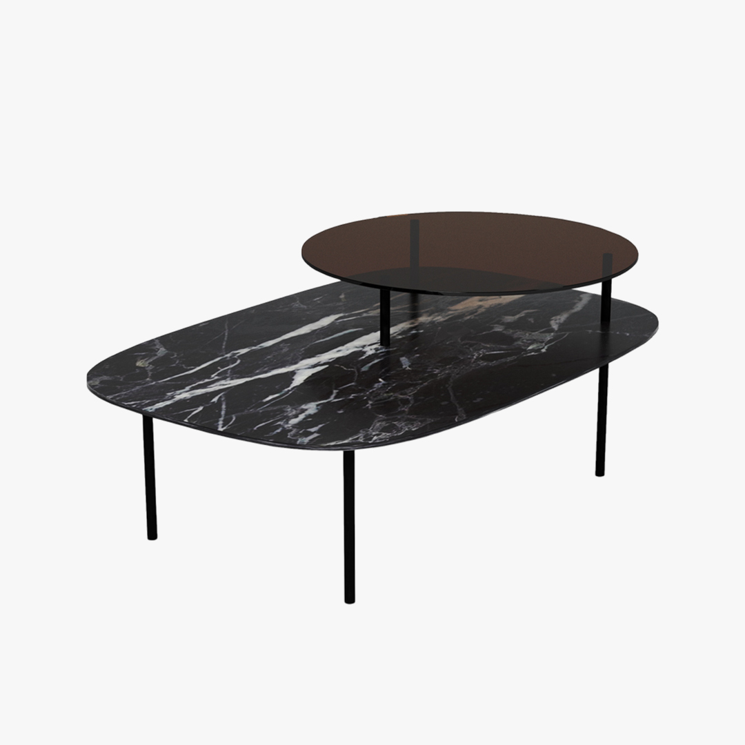 Table top in Smoked glass and nero marquina marble. Legs in black lacquerEd metal.