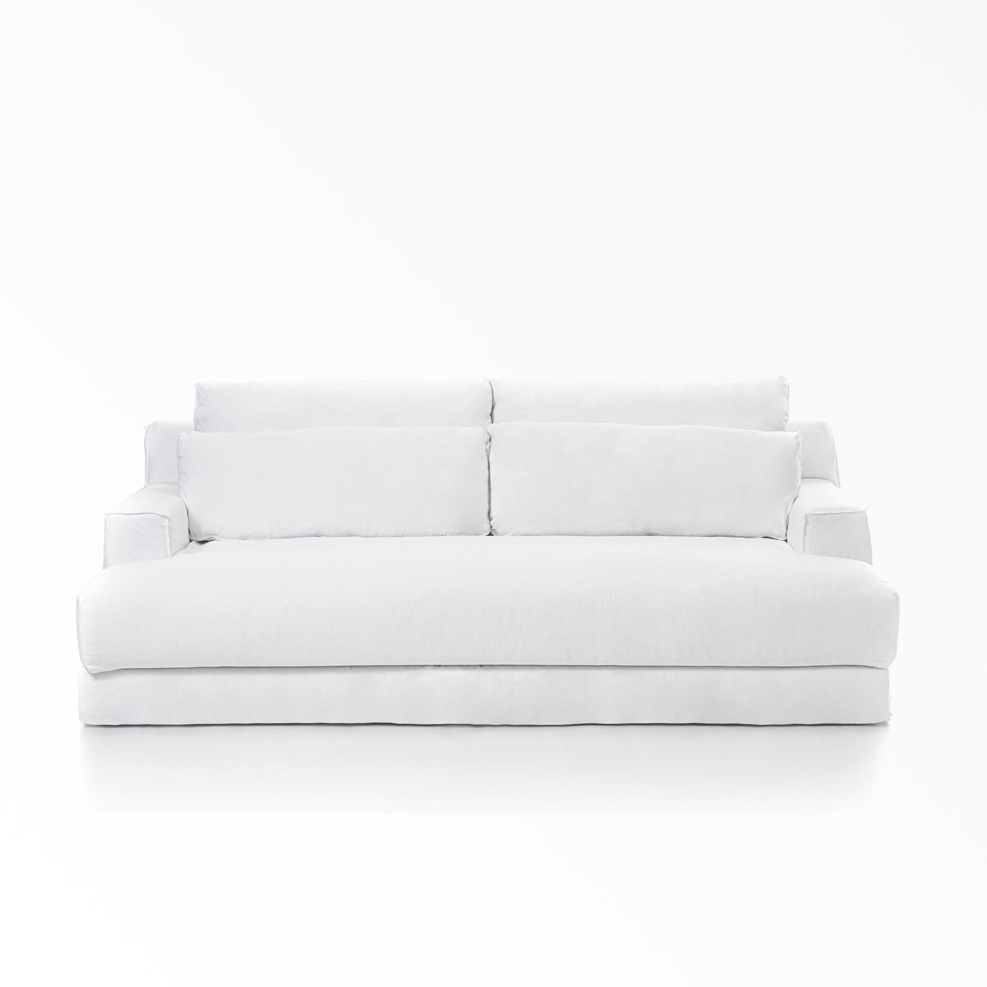 Loll 16 Sofa, frame in solid wood upholstered with variable-density polyurethane foam. Seat cushions in channeled goose down, with core insert in high-resilience, variable-density polyurethane foam and independent pocket springs. Two backrest and two lumbar cushions in channeled goose down and polyester fibers. Removable covers.