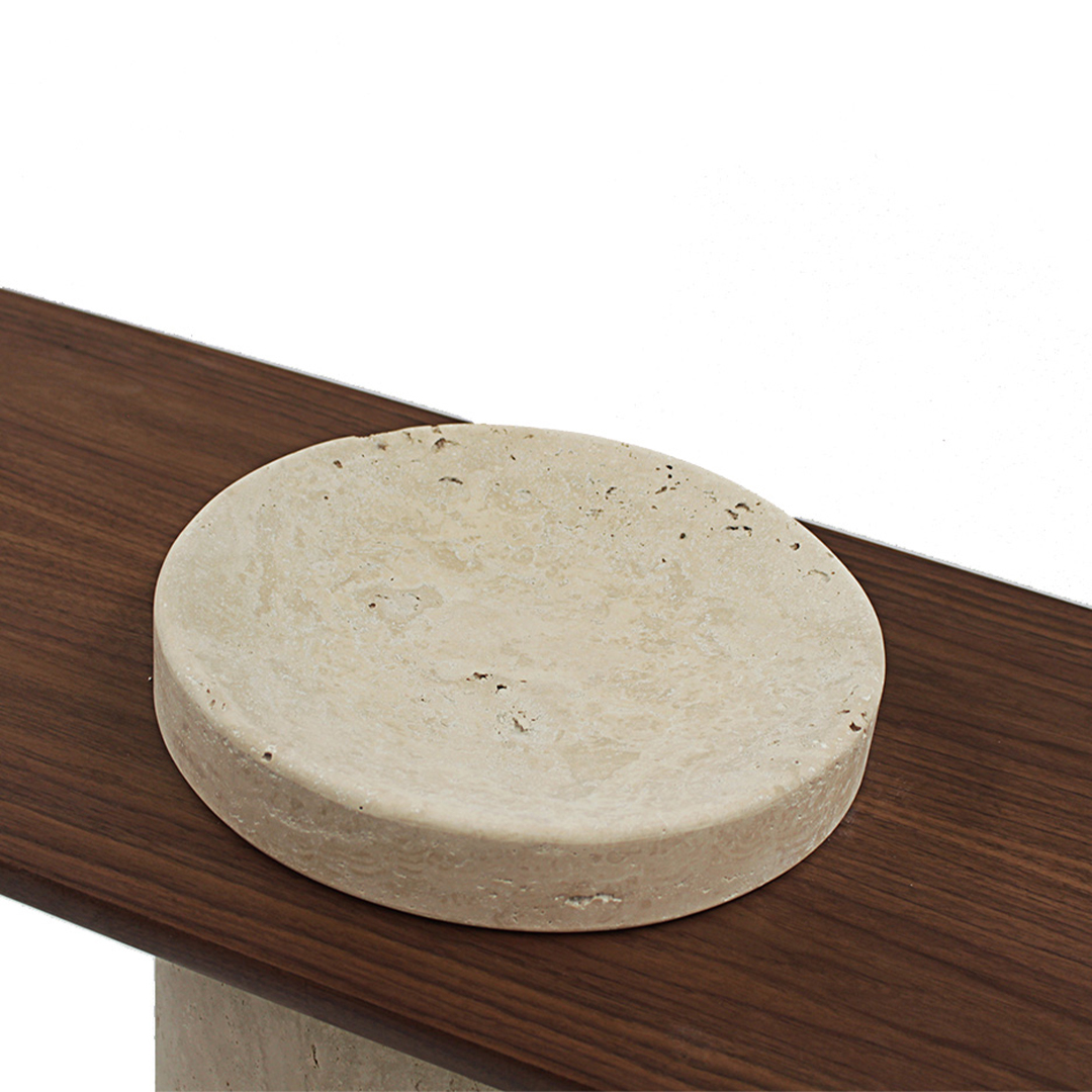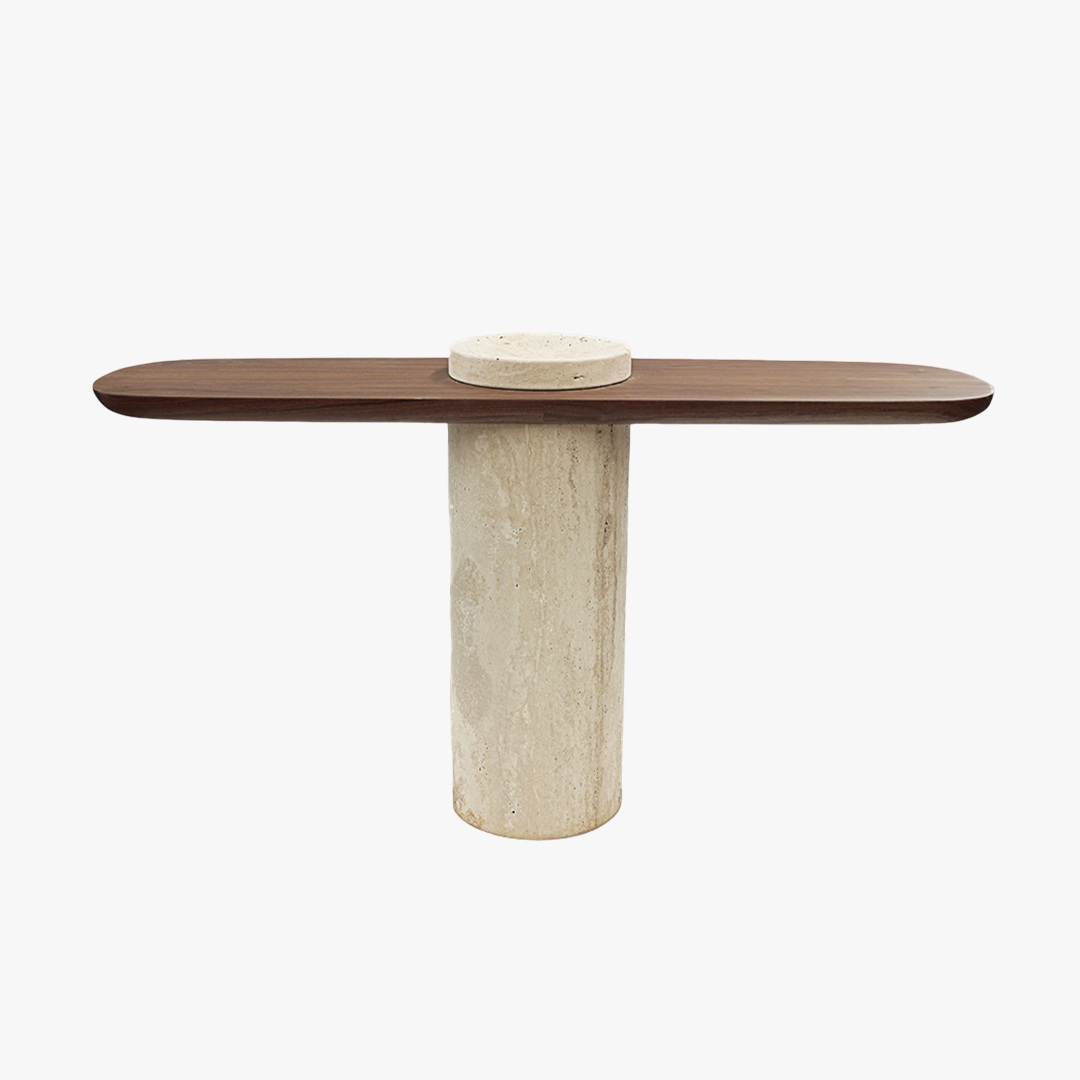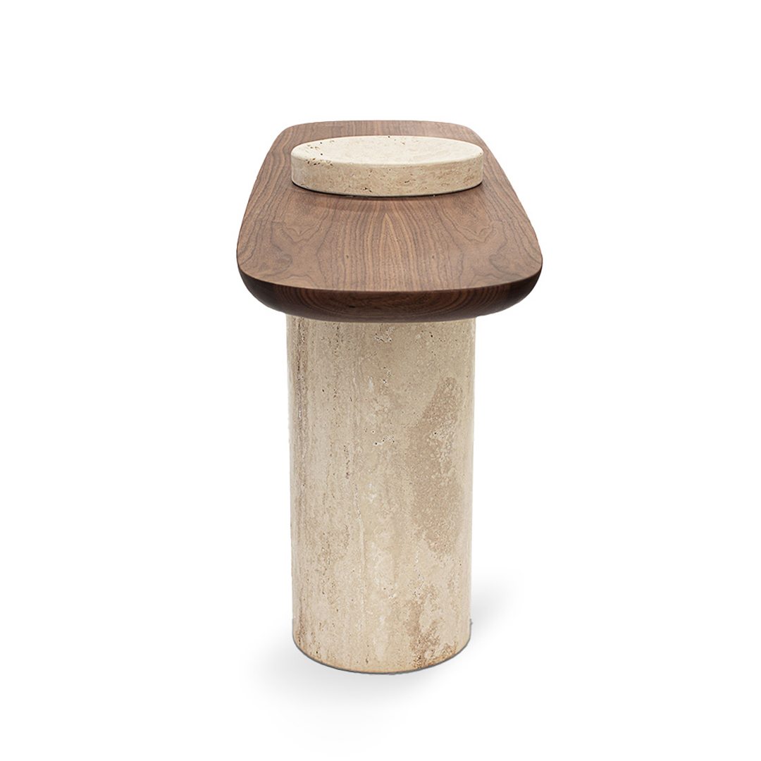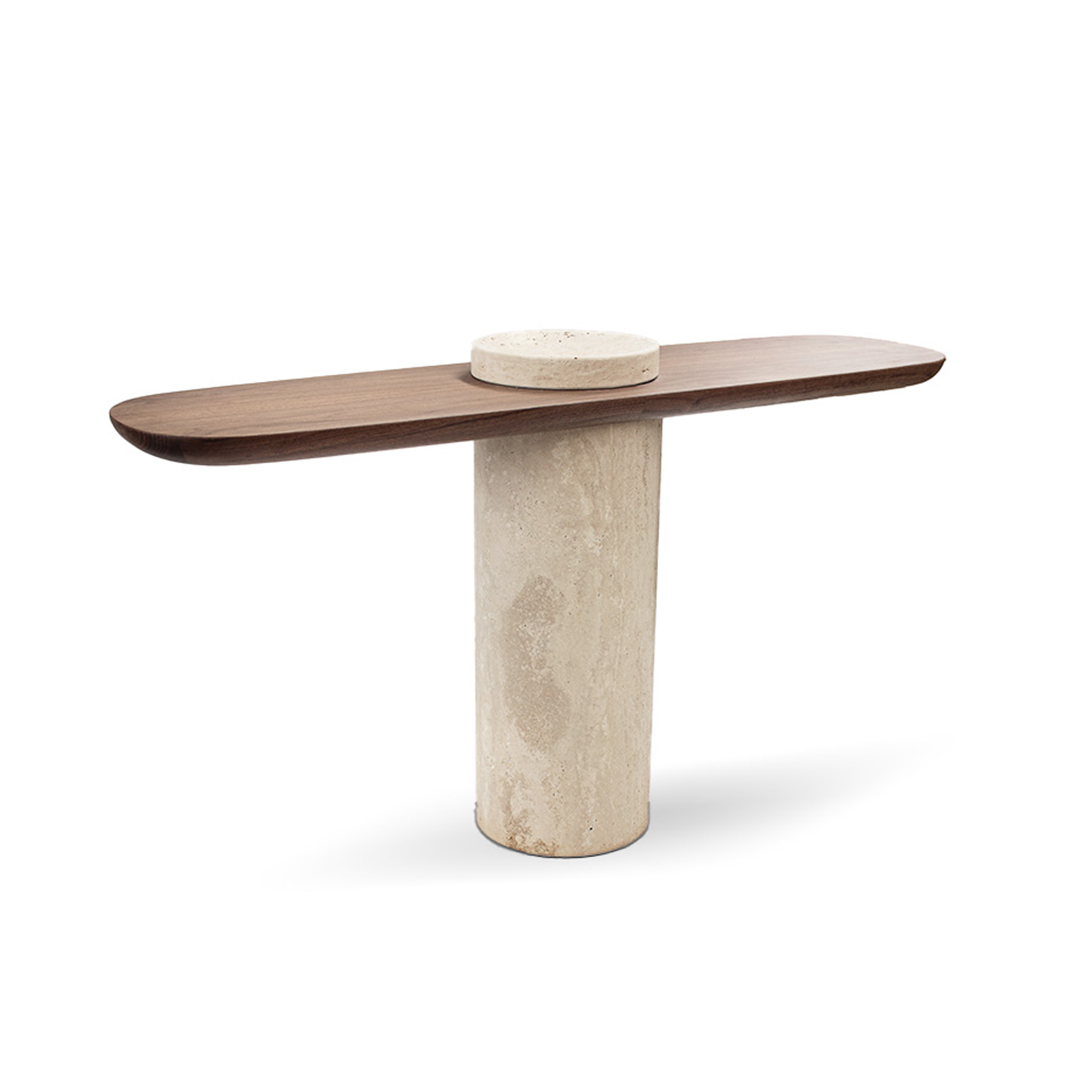 CollectorThe Poise Console is an elegant and versatile console table: its leg and structure are in Travertino and its top is entirely made of walnut or oak wood in its standard version.